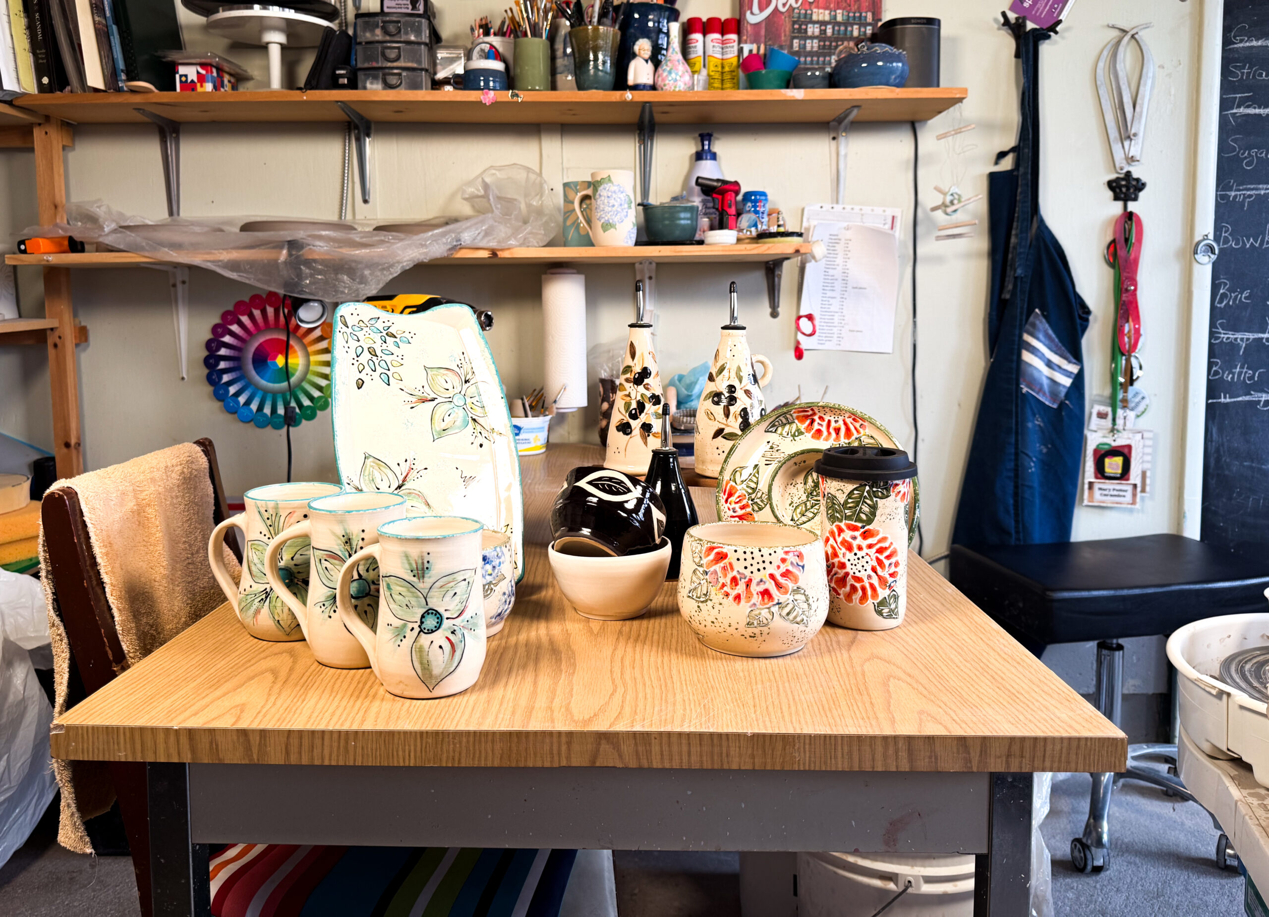 Pottery works of art featuring florals and cute animals