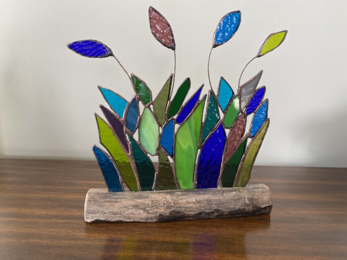 Falling Leaves Panel Inlaid on Driftwood Base – Blues, Plum & Greens     Â