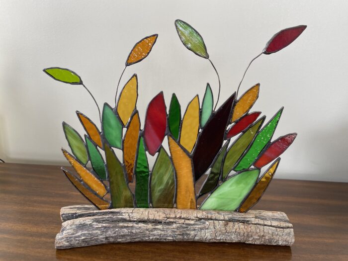 Falling Leaves Panel inlaid on driftwood base – Golds & Greens     Â