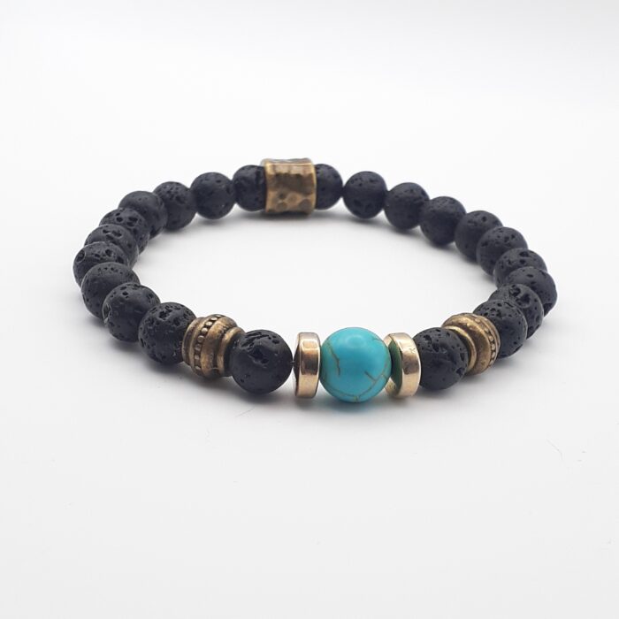 Turquoise Blue Howlite and Black Lava Stone Beaded Stretch Bracelet