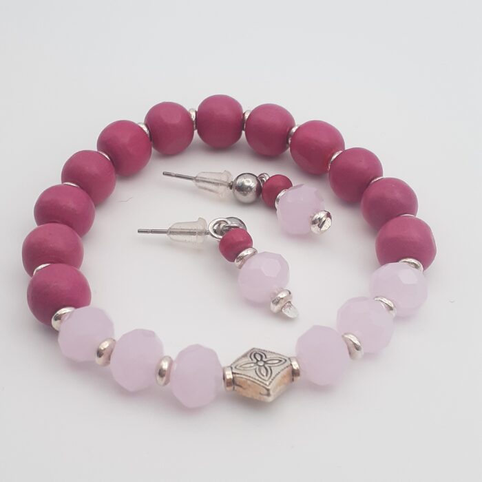 Vibrant Fushia Wooden Beaded Stretch Style Bracelet with Soft Pink Czech Faceted Crystals Paired with Complimentary Post Stud Earrings