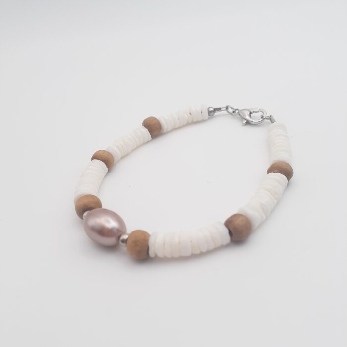 Taupe Pearl Bracelet with Natural Wood Beads and White Heishi Beads