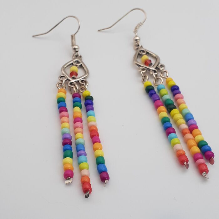 Rainbow fringe seed bead silver dangle earrings
