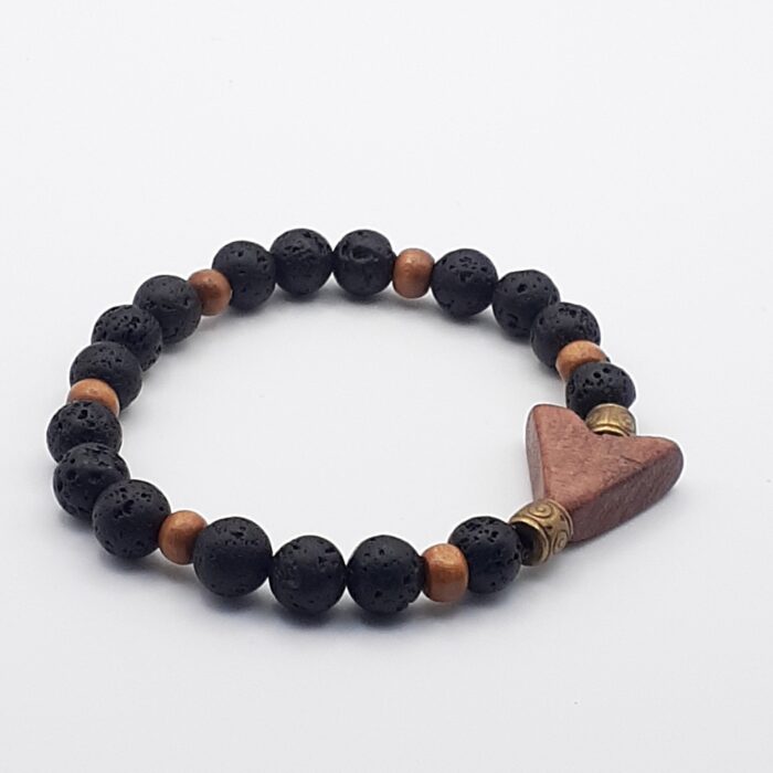 Carved Rustic Wooden Focal Pendant on a Black Lava Stone Stretch Bracelet