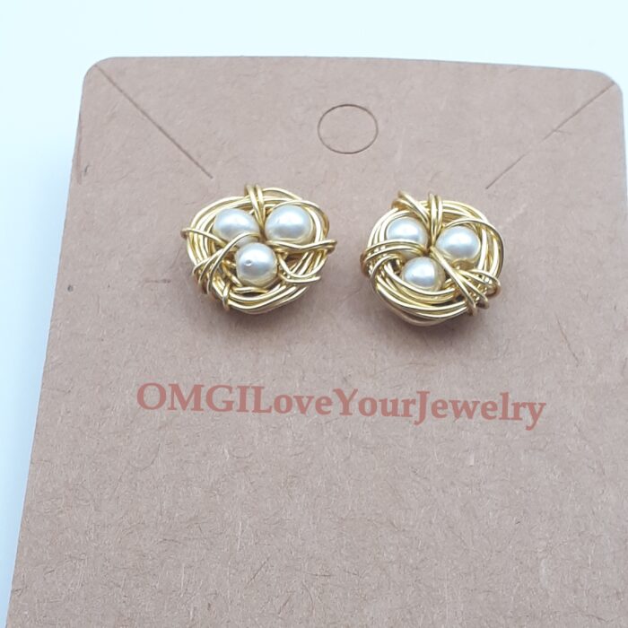 Tiny Gold Colour Wire Wrapped Pearls Bird Nest Post Stud Style Earrings
