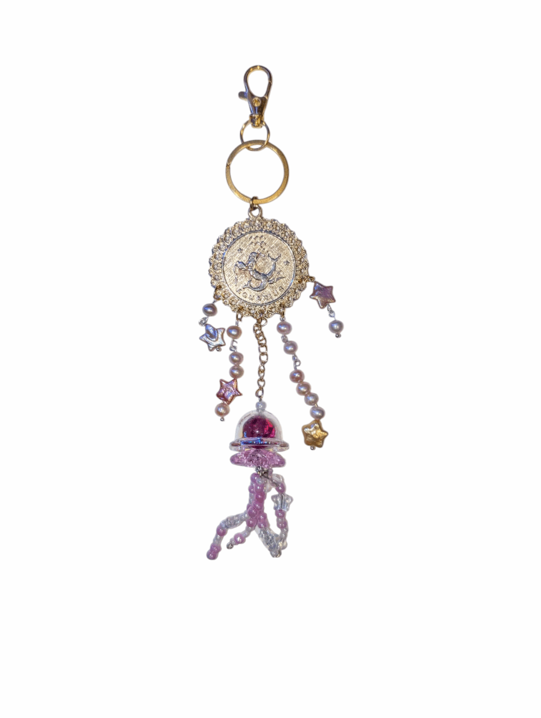 A touch of celestial charm to add to your keys or bag with this Aquarius keychain. Featuring a gold Aquarius medallion, freshwater star pearls, regular freshwater pearls, and a unique jellyfish-style beaded charm, this piece blends zodiac energy with dreamy, whimsical design.