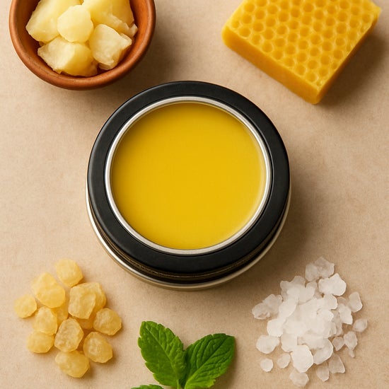 Ingredients: arnica infused olive oil, tallow, beeswax, vitamin e, camphor essential oi, frankincense essential oil, peppermint essential oil, Limonene*, Pinene*, menthol*
