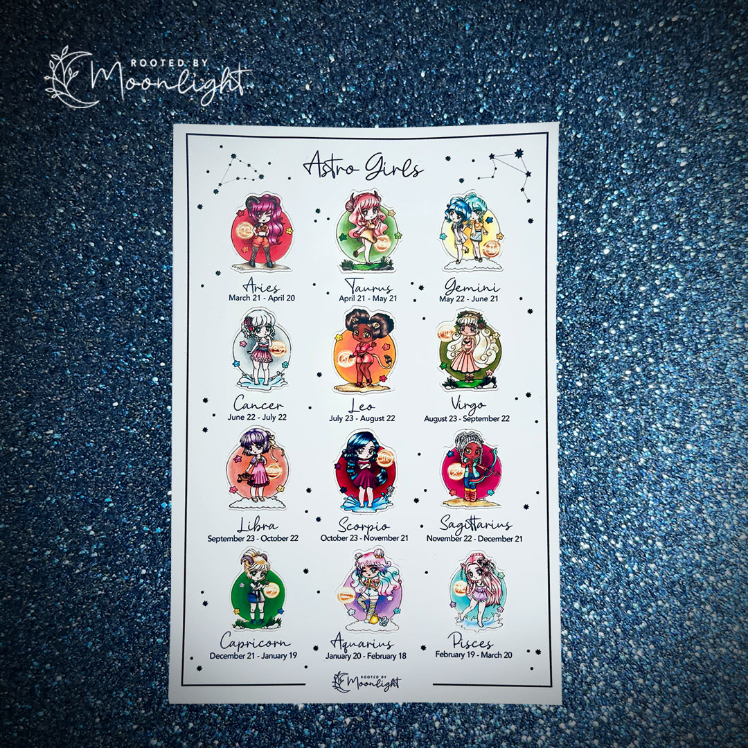 Full collection of the adorable chibis from all 12 zodiac signs on one sticker sheet, each with their own personality and style to match their stars.