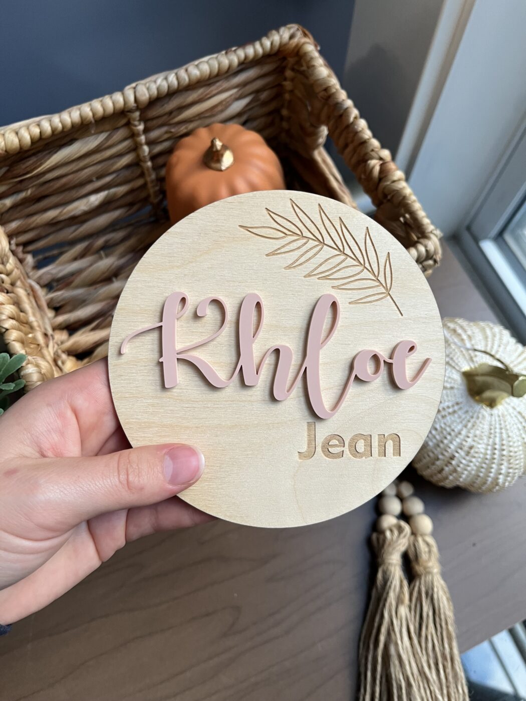 These mini name signs are perfect for announcing the arrival of your newest family member. Their name is laser cut out of quality coloured acrylic, and placed on a baltic birch plywood backing with leaf detail and middle/last name engraved.