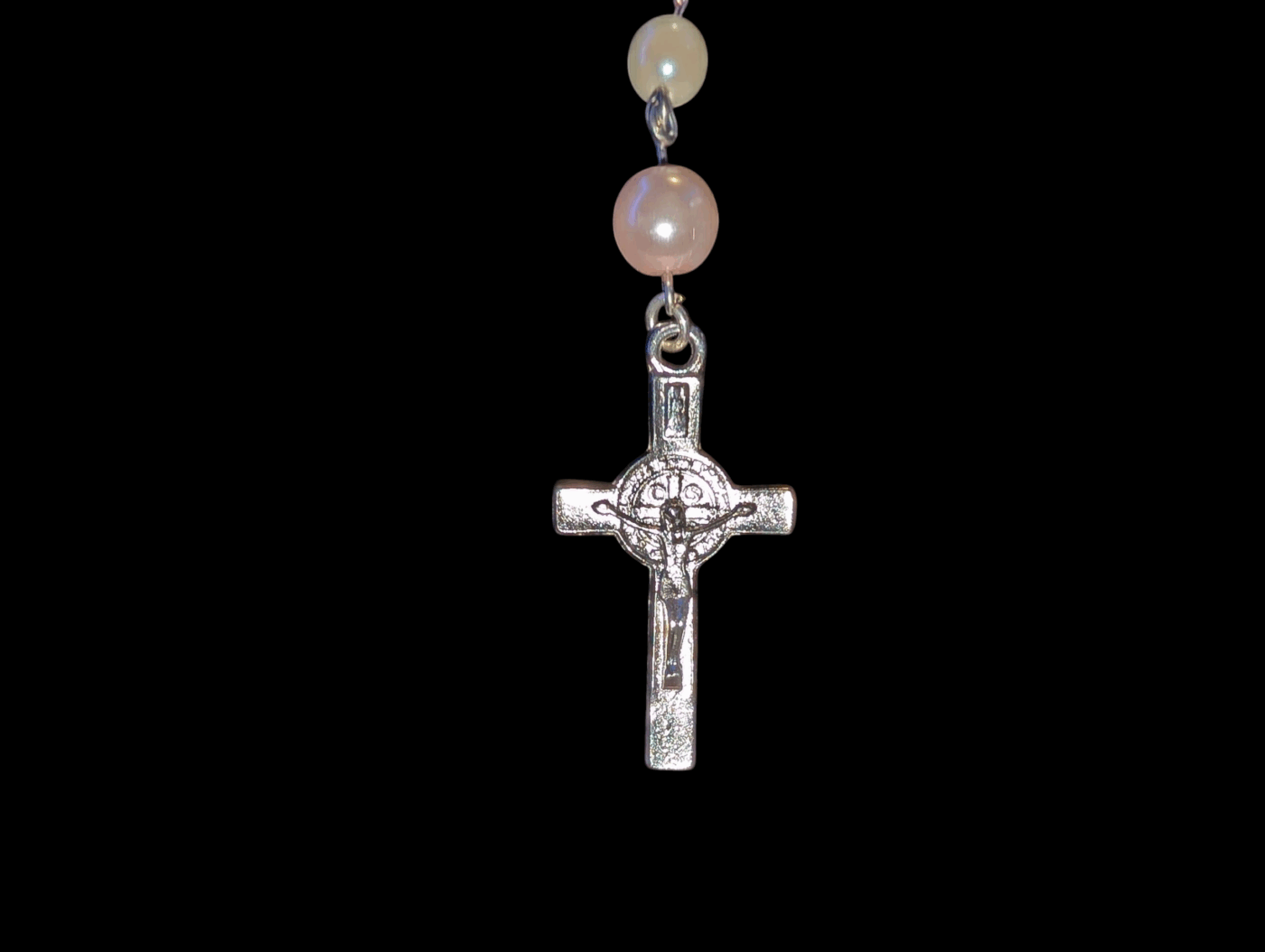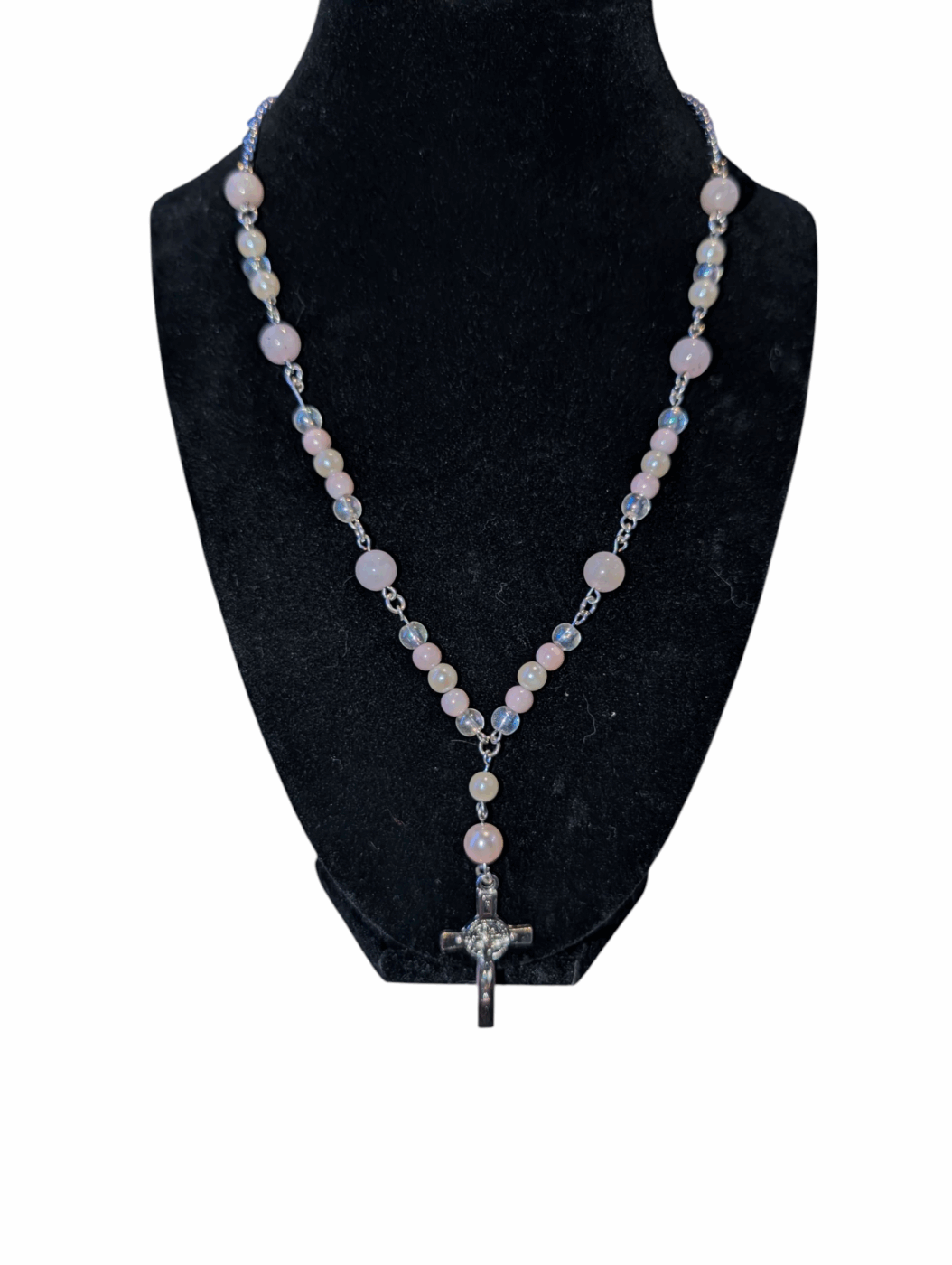 The Bearing the Cross is a rosary-style necklace crafted in soft pink and creamy tones, blending innocence with quiet devotion. Smooth beads lead the eye toward the central cross, creating a gentle yet striking contrast between sweetness and solemnity. Delicate, graceful, and symbolic, this necklace offers a serene beauty with a touch of reverence. Made in Silver.
