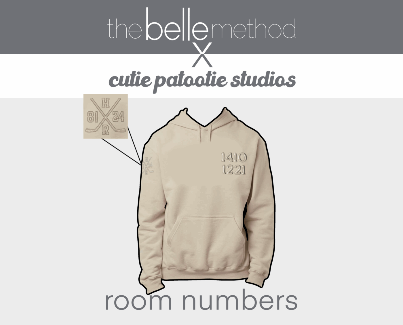 belle x cutie room numbers hoodie – sand