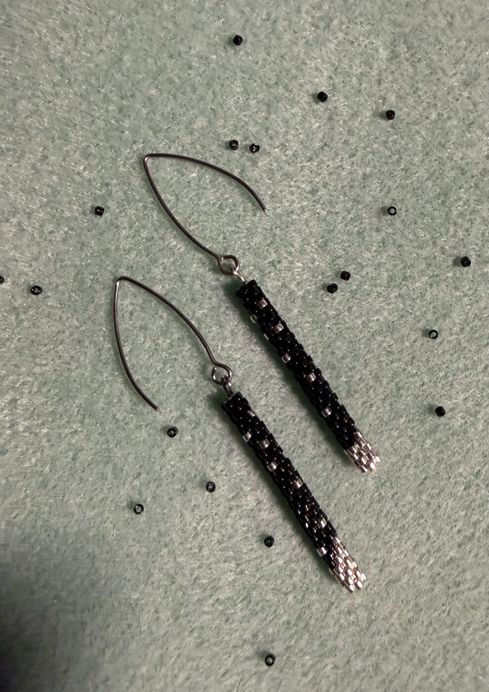 These hand-beaded earrings feature black and silver beads and measure approximately 1.75″ long.