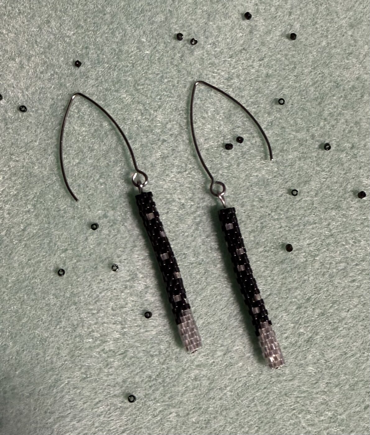These hand-beaded earrings feature black and silver beads and measure approximately 1.75″ long. Some added pizzazz with them being glow-in-the-dark.