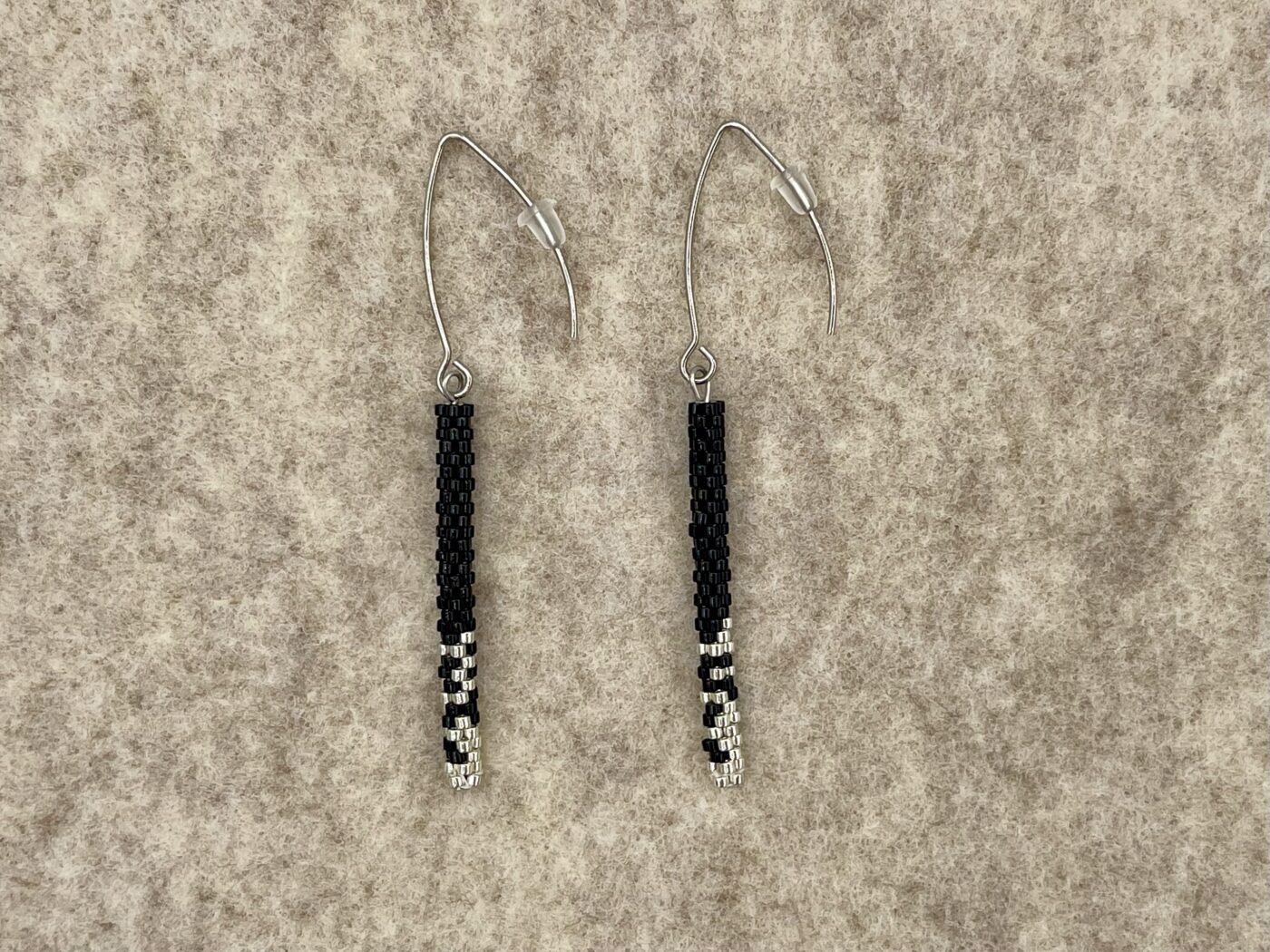 These hand-beaded earrings feature black and silver beads and measure approximately 1.75″ long.