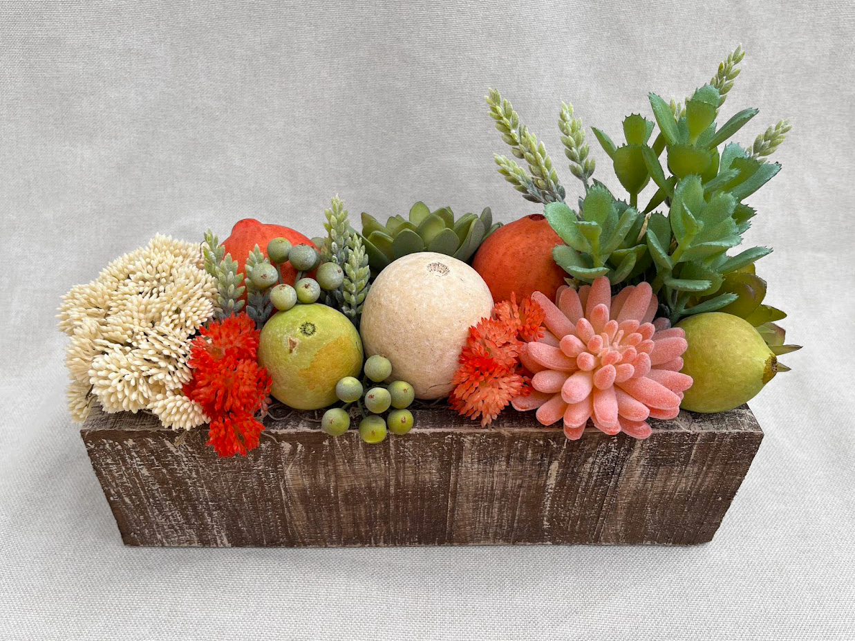 This design is my take on the traditional horn of plenty. The locally hand-made wooden box is overflowing with faux succulents, plants and realistic colourful fruit.