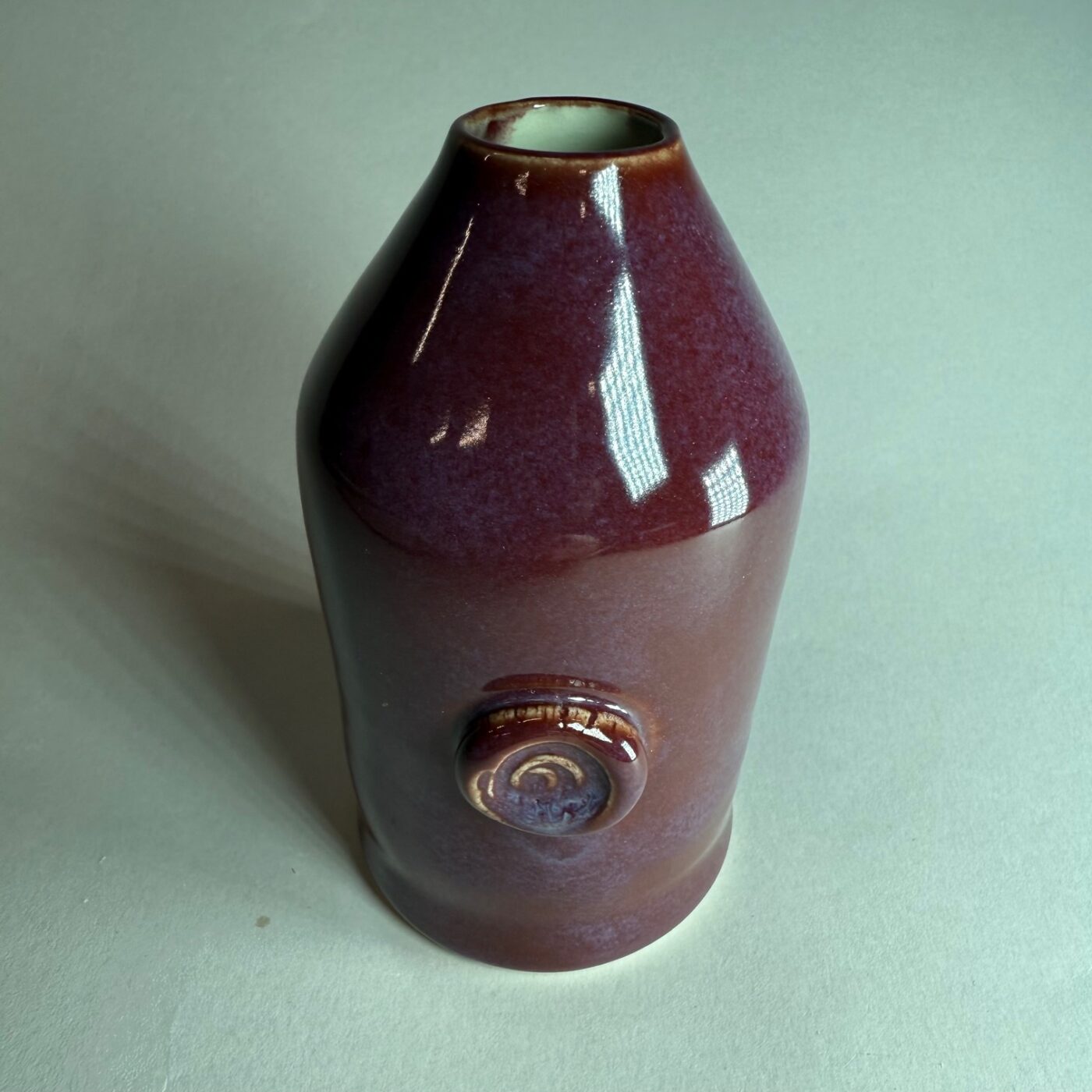 This bud vase has been wheel thrown, decorated with a swirl button design for interest and glazed in rich sangria and violet crystals. This vase is meant to hold a small posey flower bouquet.