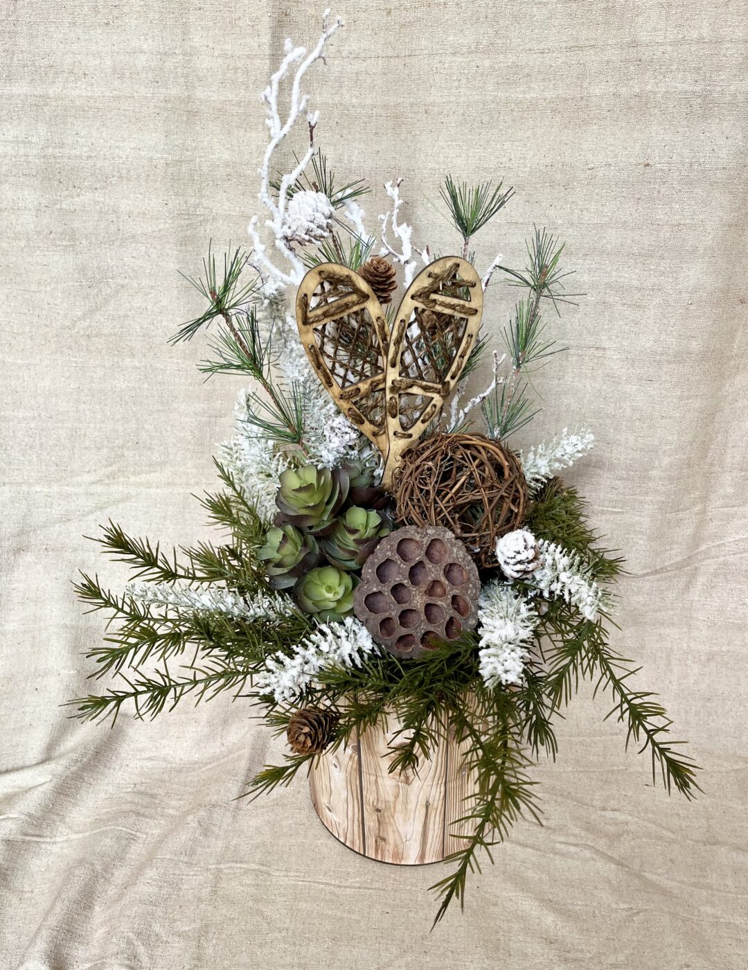 This design is heavily influenced by our dad’s snow shoes that he had at the cottage and the wood paneling that lined the interior walls. This upcycled container has a wood-look design and is arranged with faux succulents, natural elements and everlasting greenery to show off those awesome mini show shoes. This piece will have you dreaming of your own cozy cabin in the woods.
