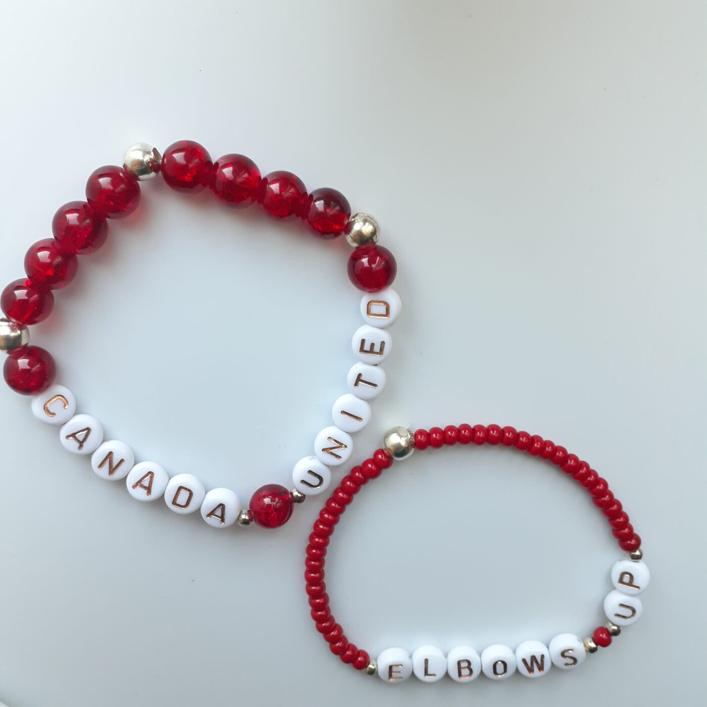 Canada United and Elbows Up Alpha Letter Beaded Red and White Stretch Bracelets Set of 2
