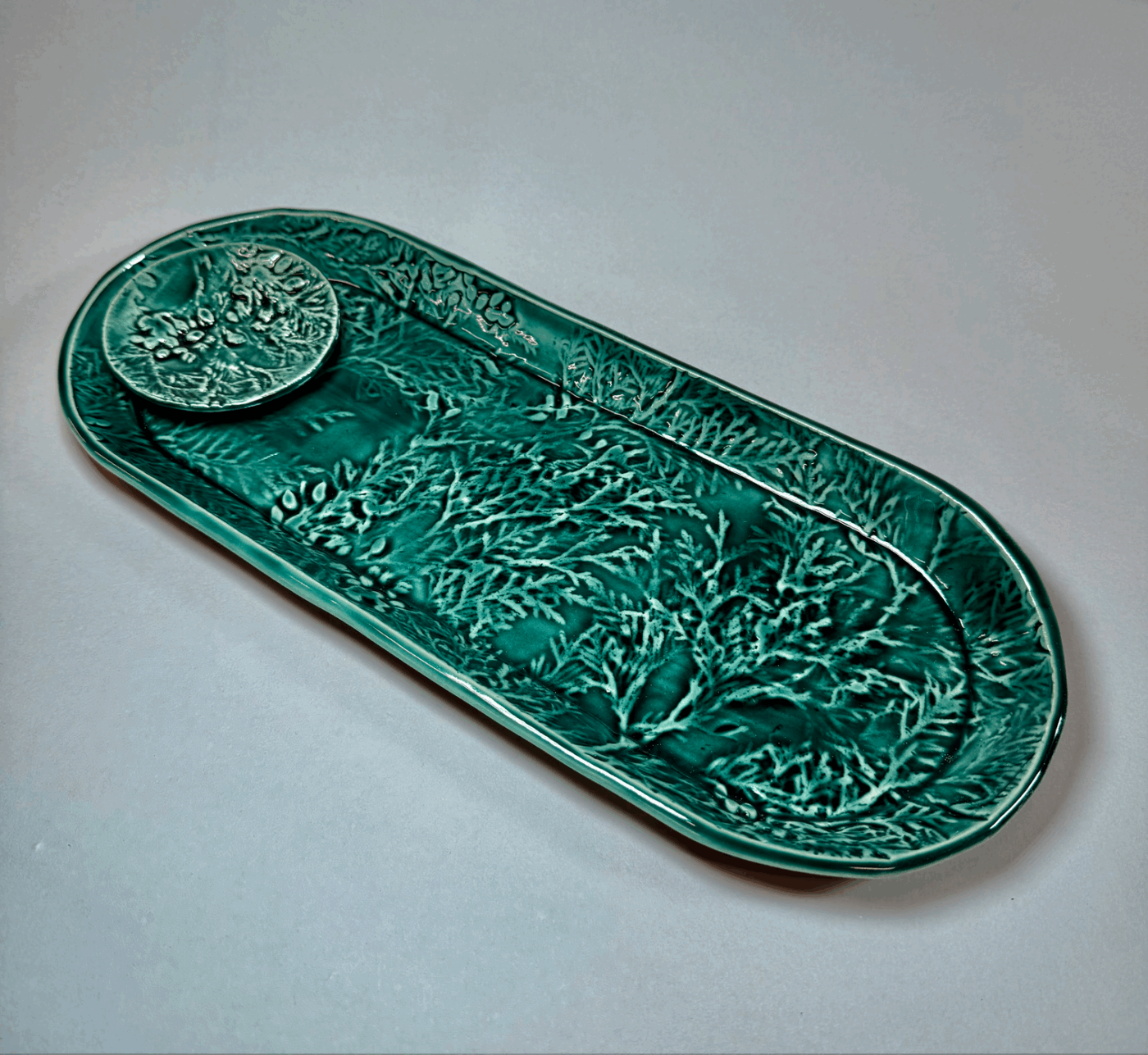 This is a hand built, all-in-one shallow tray and small, permanently attached bowl that has been textured with cedar boughs and glazed in a deep translucent forest green.