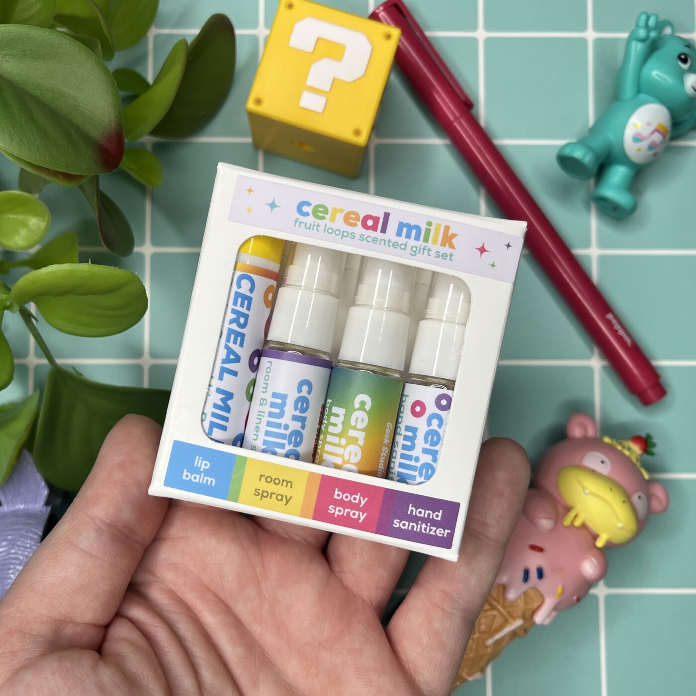 The perfect little set to try a variety of products. Each set comes with 4 products all in the same scent. A full sized lip balm along with mini sprays of body spray, room spray and hand sanitizer spray.