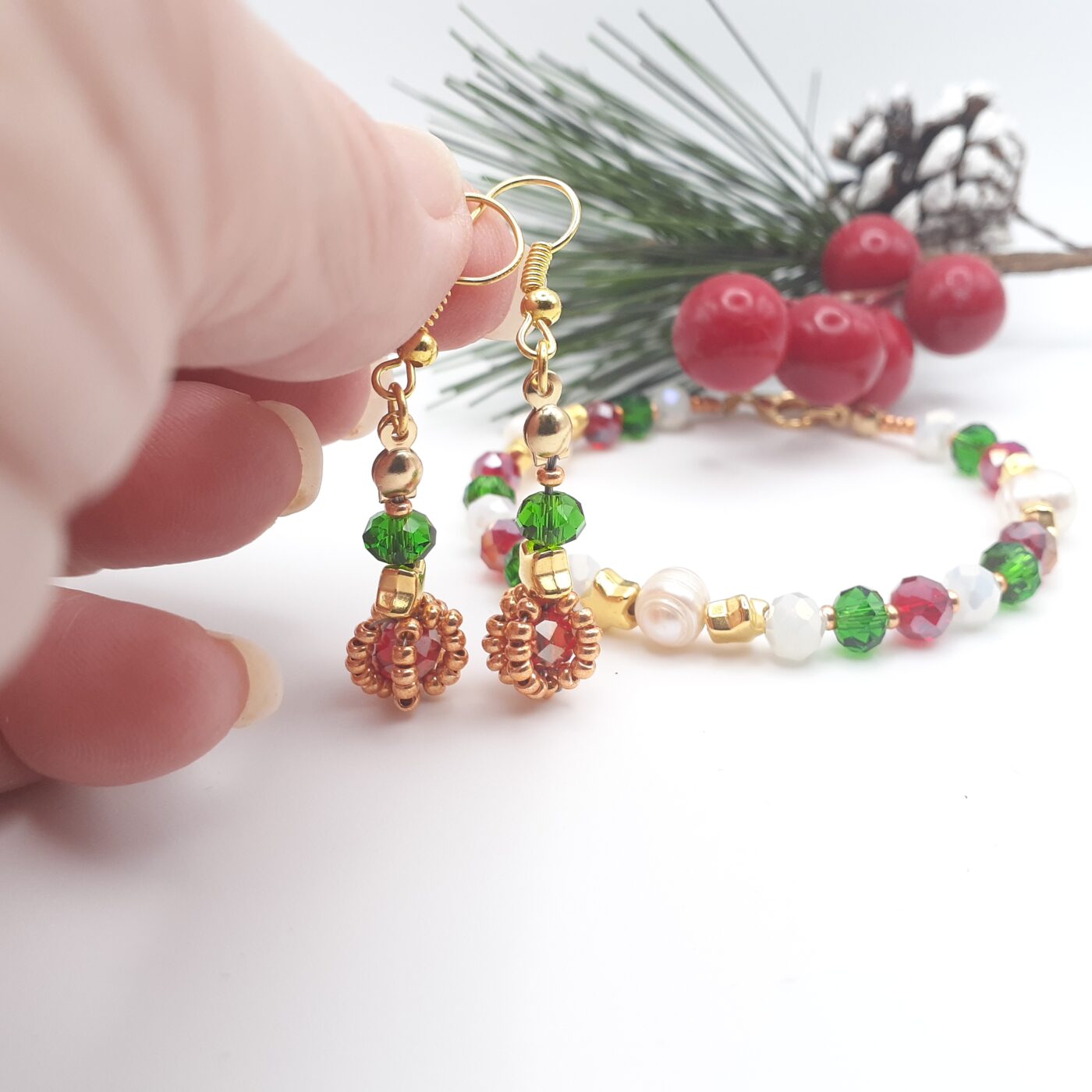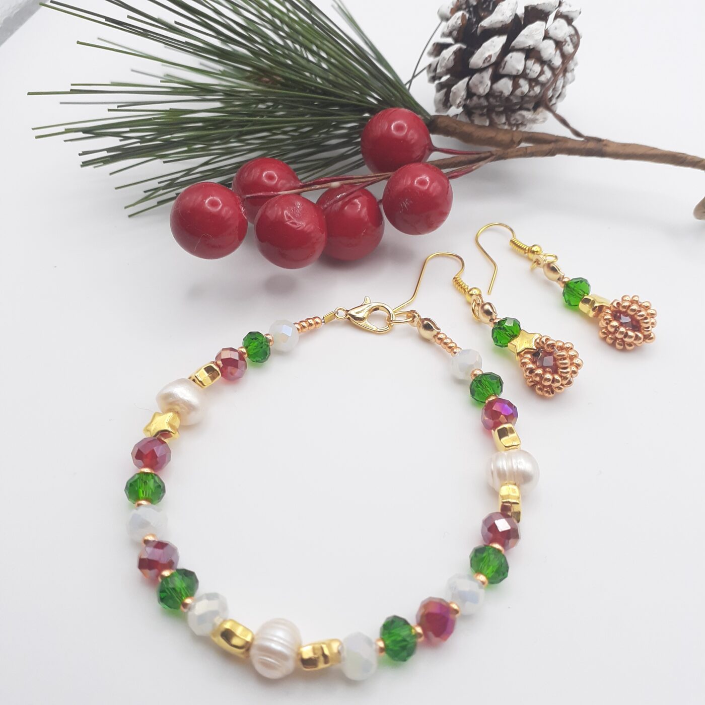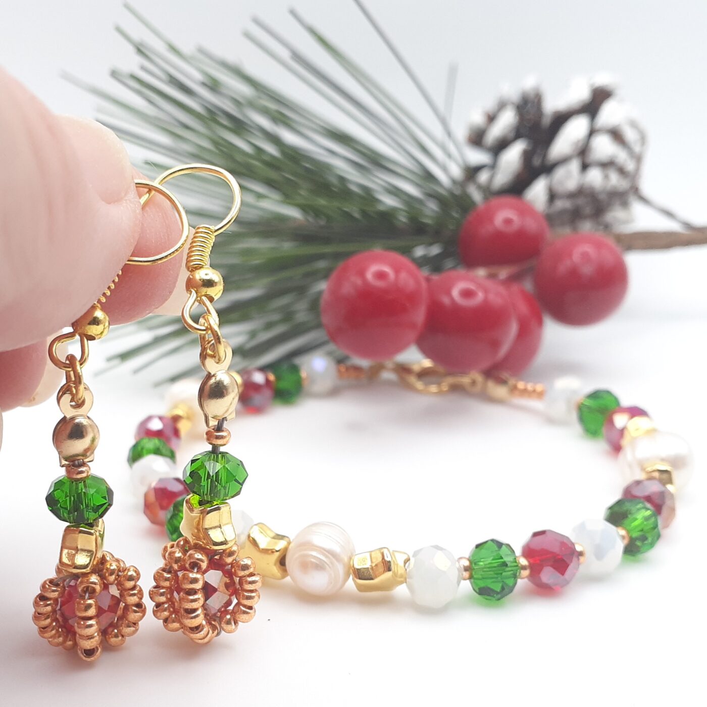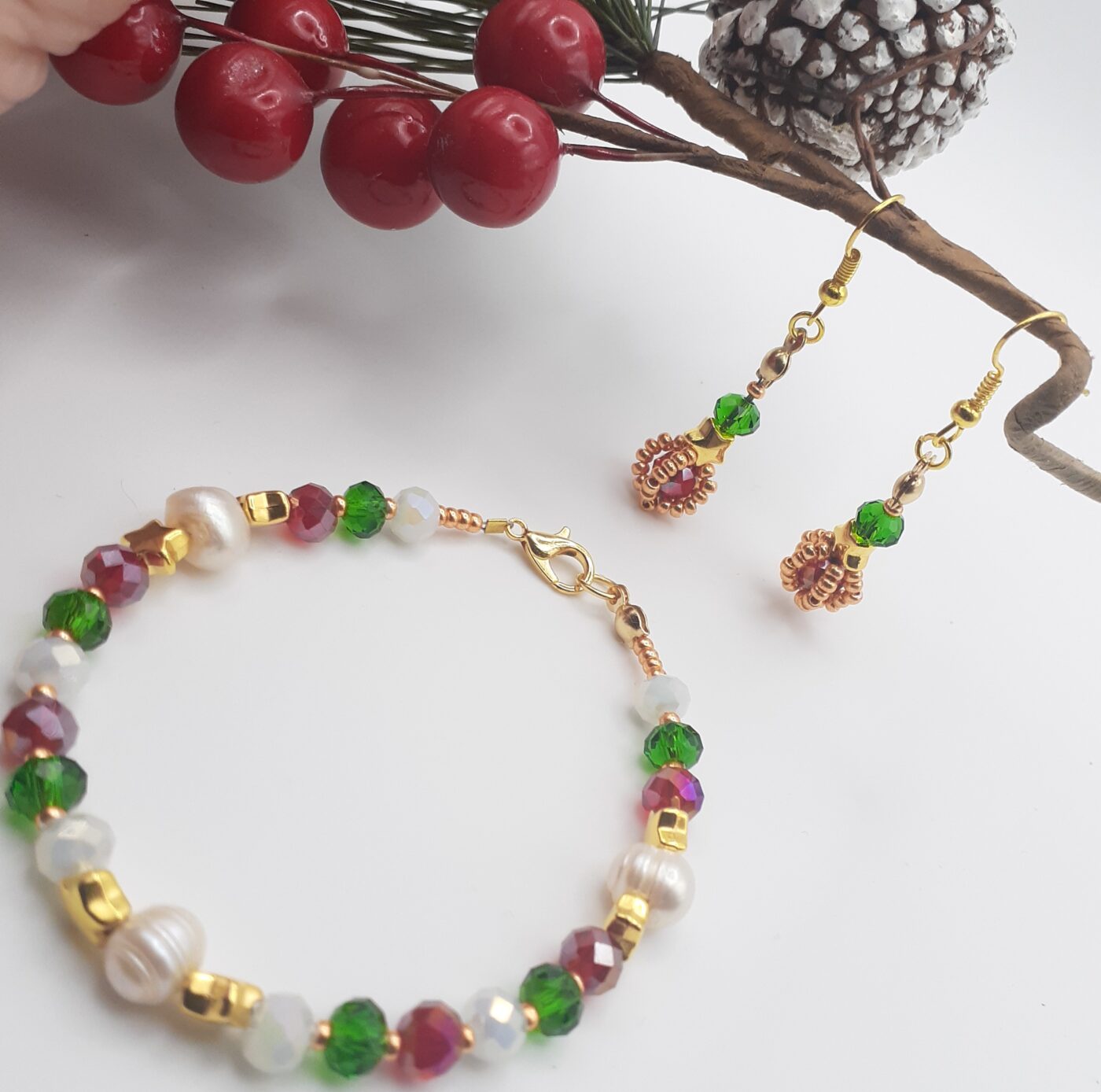 Christmas Red Green White and Gold Bracelet with Freshwater Pearls and Earrings Set