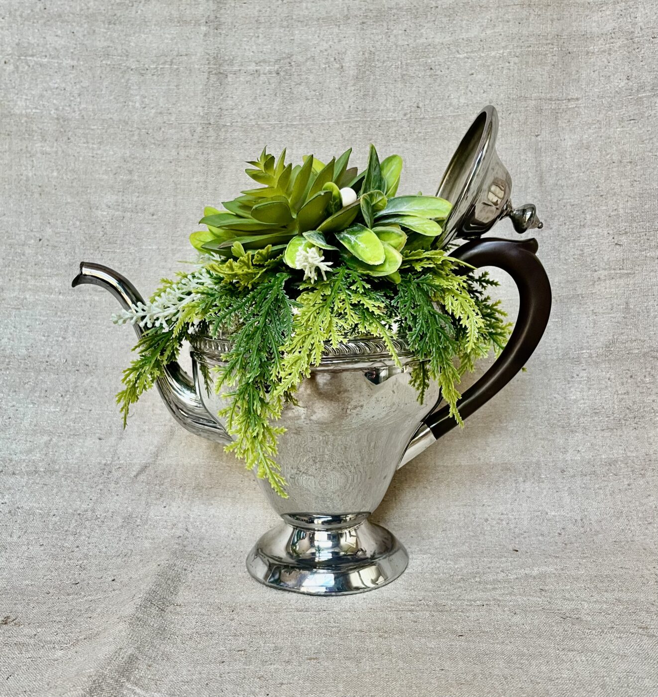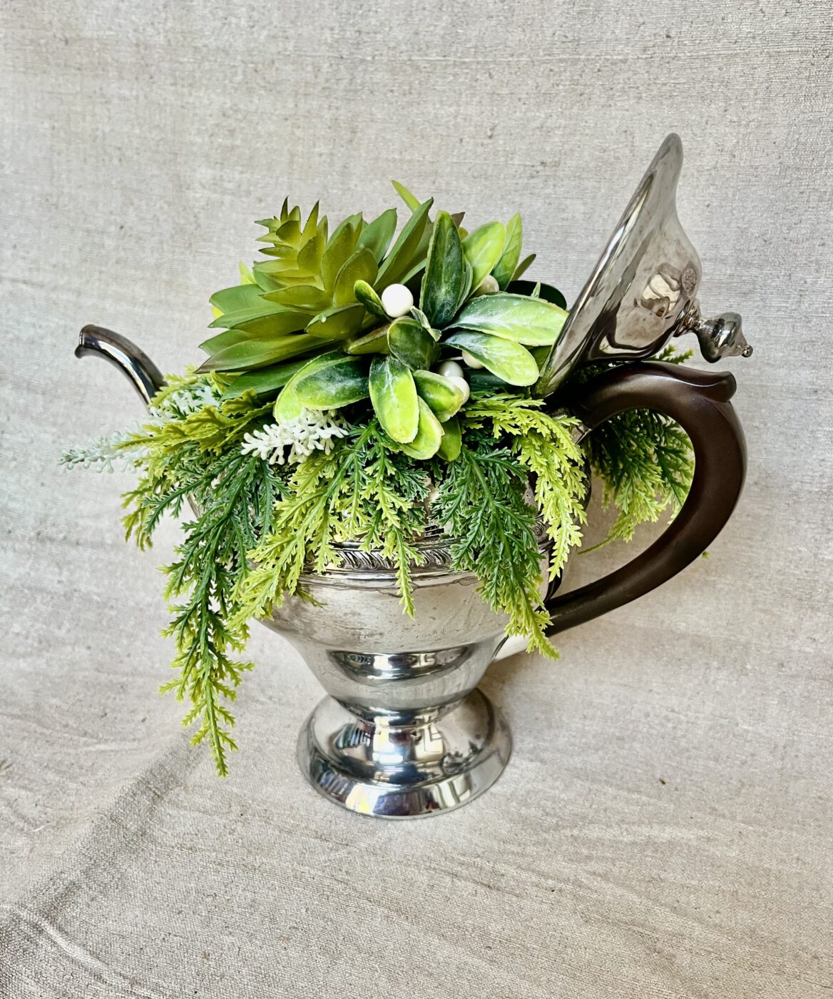 Bring a little elegance to the table with this vintage silver teapot arrangement. The realistic winter greenery mixed with the faux succulent and pearly beads give a simple, yet sophisticated look. And I have to mention that gorgeous wooden handle the drew me to this piece when I first saw it. Go ahead, use the good dishes and enjoy!