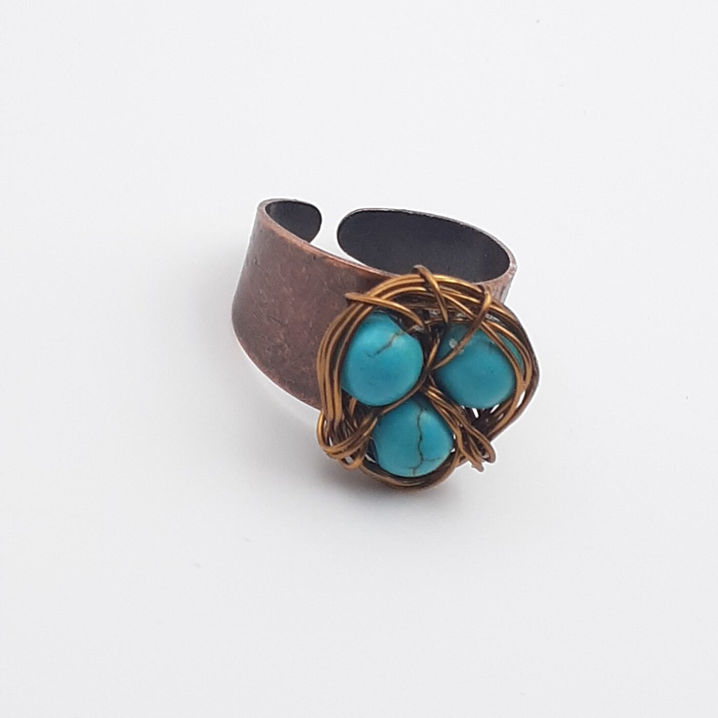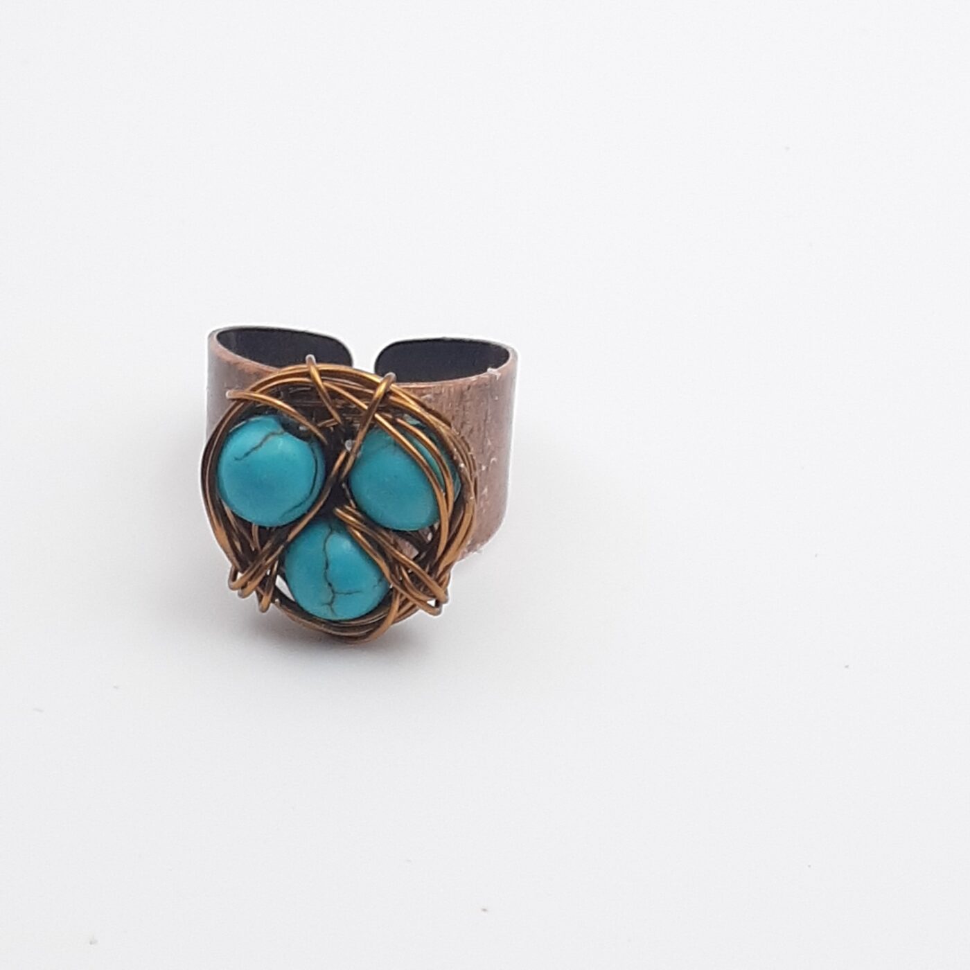 This copper Bird Nest Ring is a rustic and bohemian-style piece. It’s designed to resemble a twig bird’s nest cradling “eggs” made of turquoise howlite beads. It has a wide copper band that can be adjusted for a comfortable fit on most fingers.