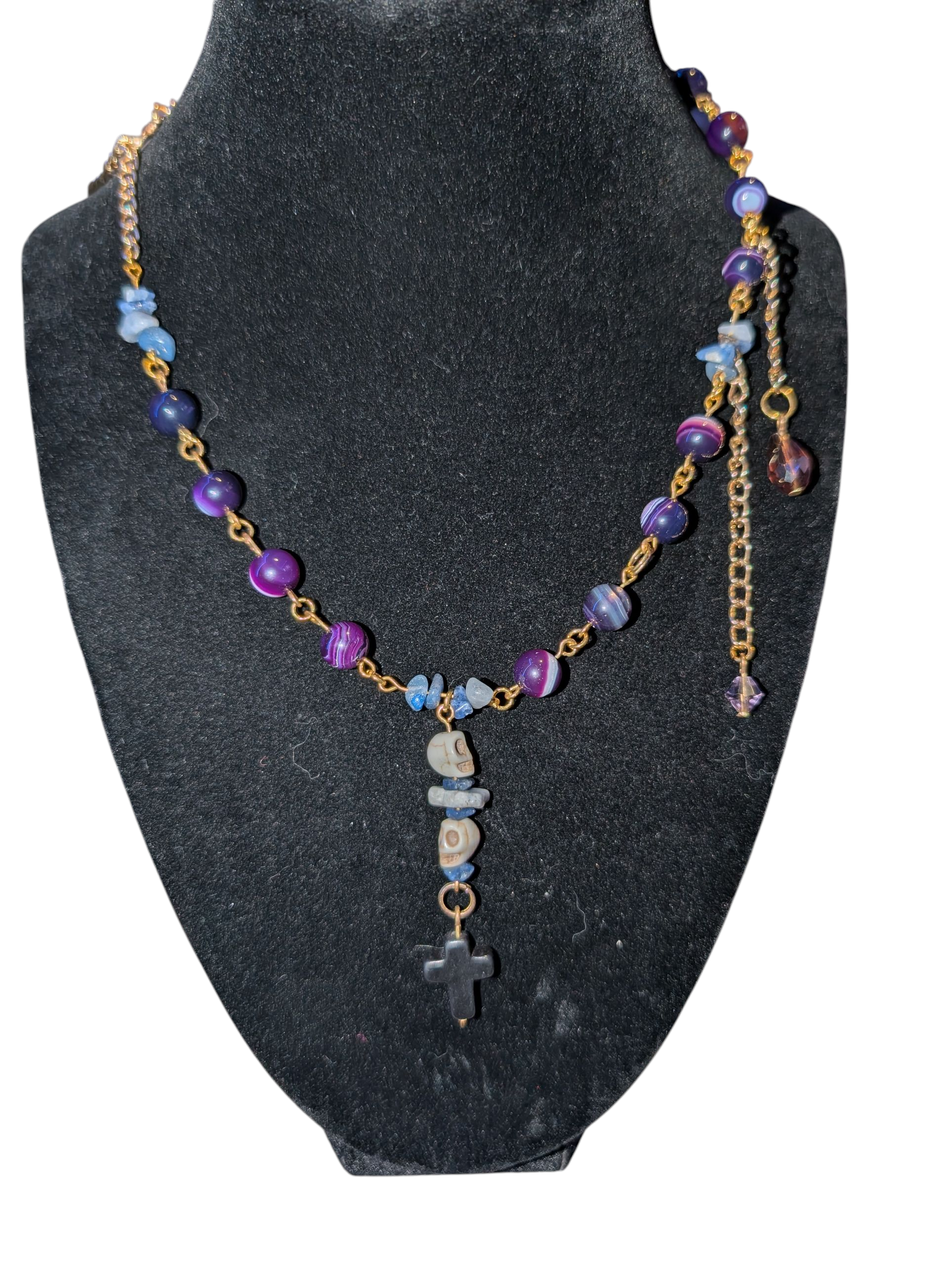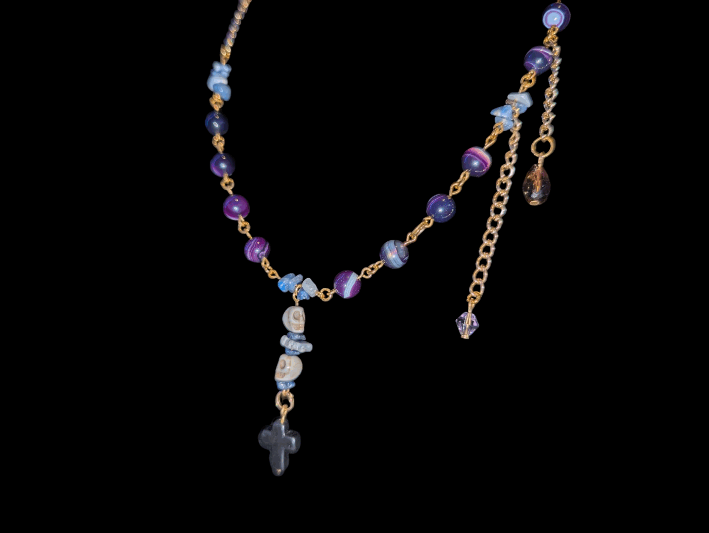 Cosmic bones features fun marbled beads, blue gemstone chips, and stunning chain drops. Made in Gold