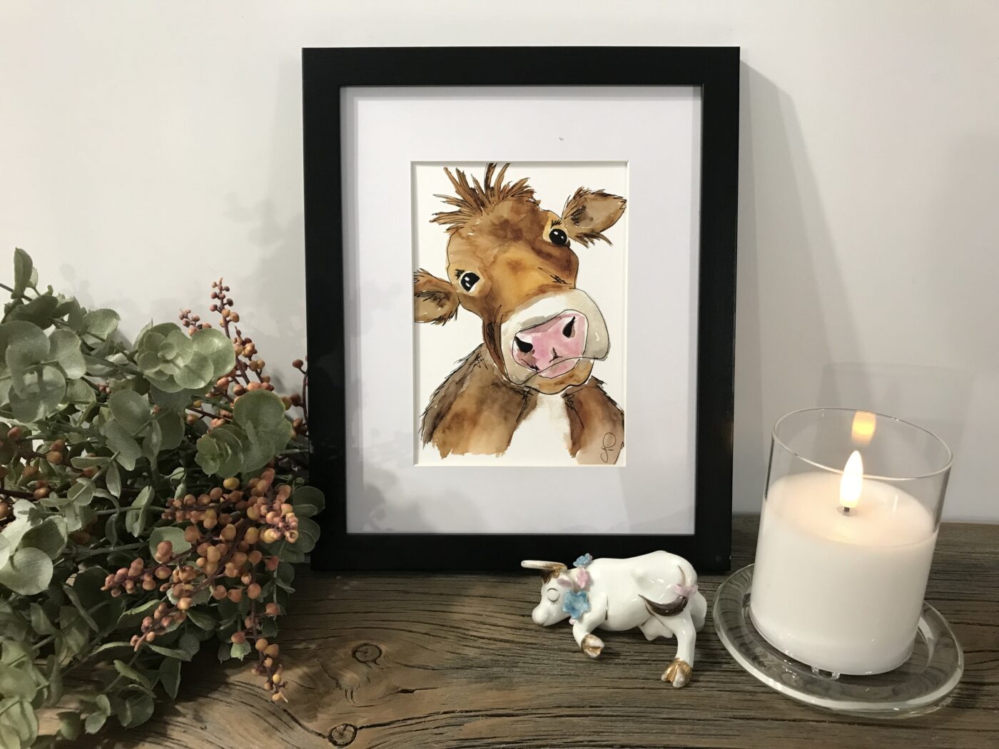 My rural roots inspired me to do this farm series. The “in your face” animals bring lots of laughter and smiles. Watercolours and ink pen that I have printed on 100lb quality paper.