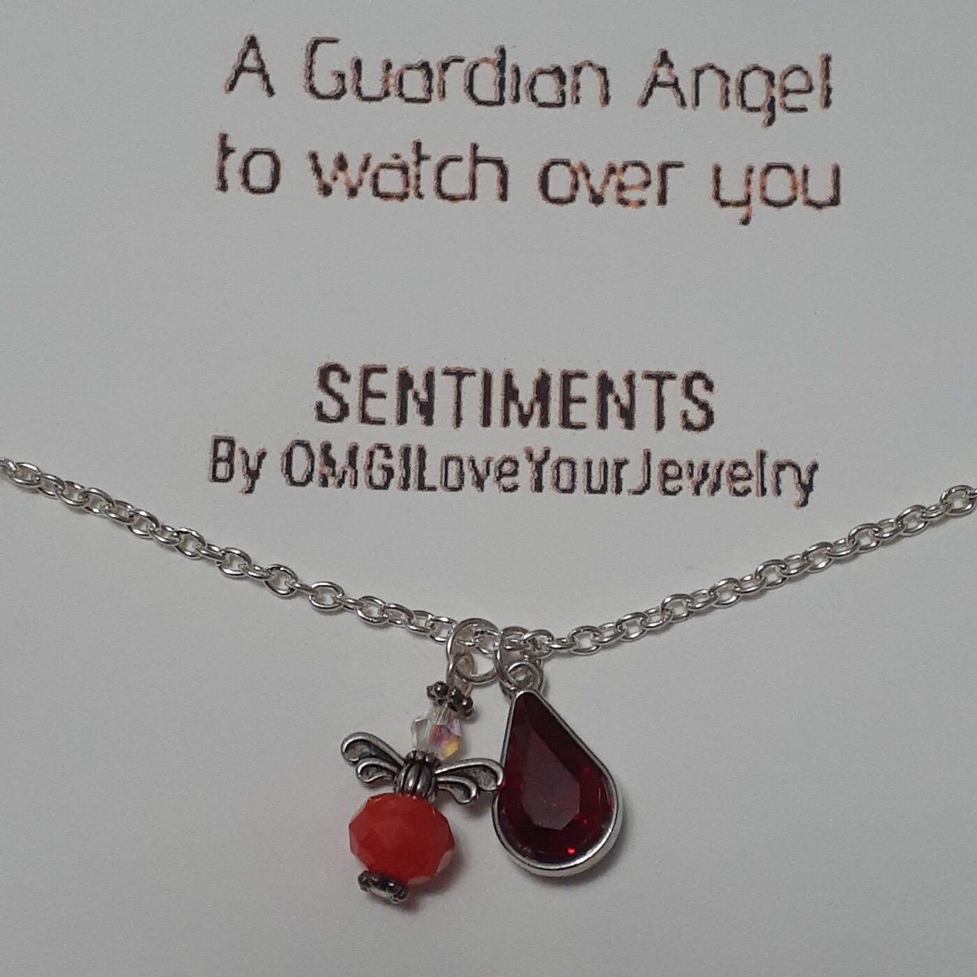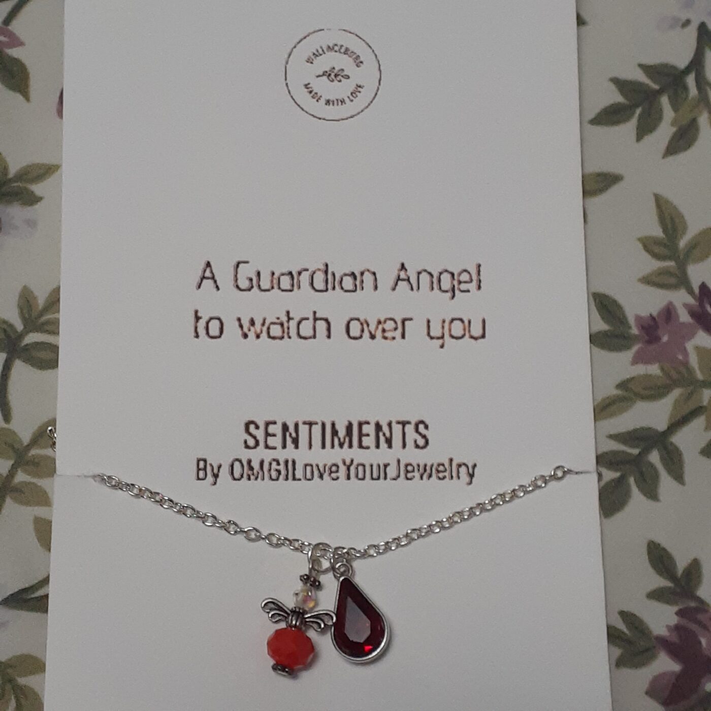 Sentiments Collection ~ Sterling silver Guardian Angel Necklace with a crimson red charm and angel handmade by me with Swarovski and Czech crystals. A guardian angel to watch over you. The sterling silver necklace measures 18.5 inches long but I can make it to suit. Please contact me.
