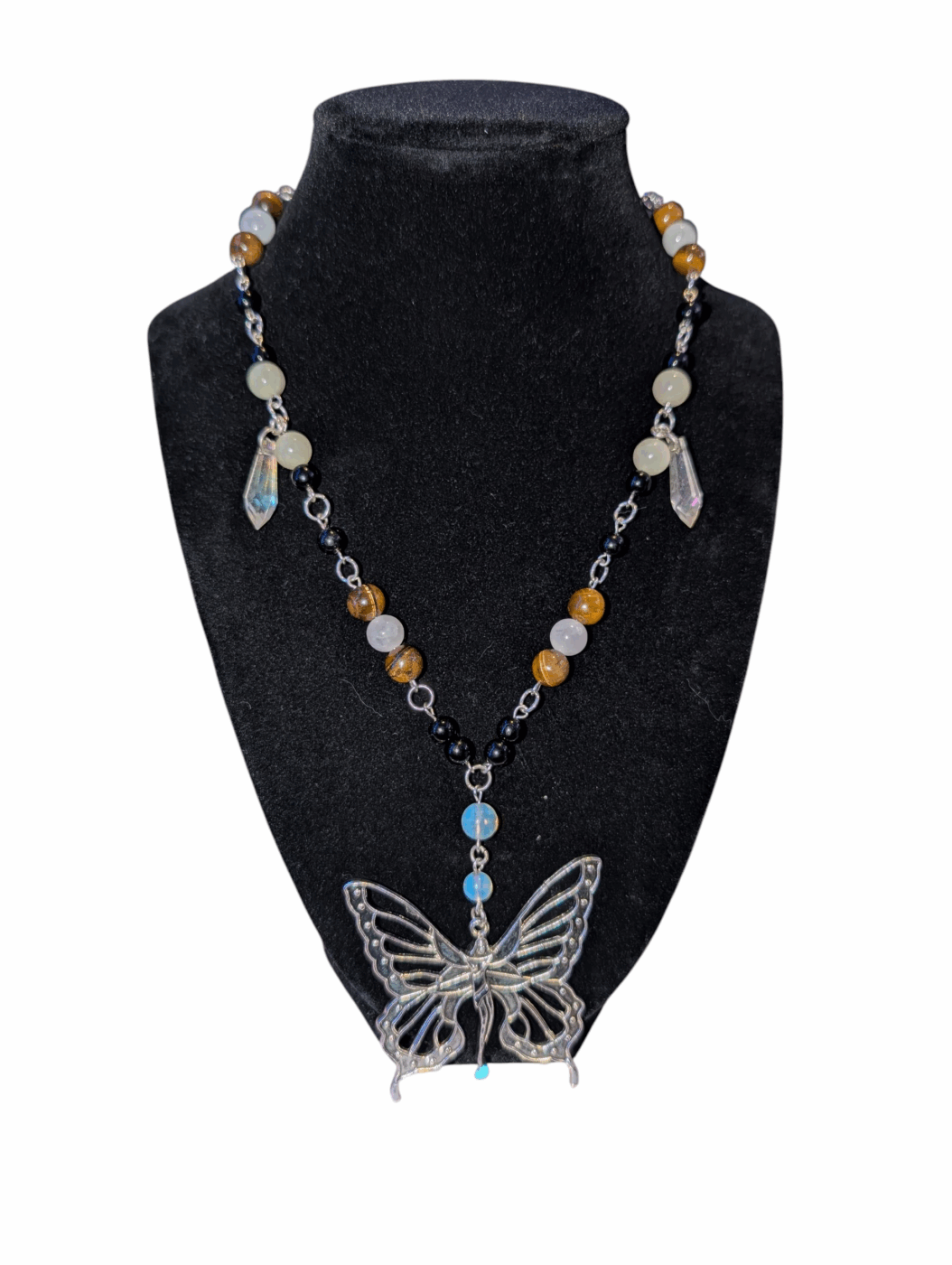 A giant fairy pendant takes center stage in this whimsical, enchanted necklace. It’s framed by a mystical blend of Opalite, Tiger’s Eye, Malaysia Jade, and dyed Jade beads, each adding its own shimmer and earthy magic. Iridescent acrylic crystals catch the light with a soft rainbow glow, giving the whole piece a dreamy, otherworldly charm.