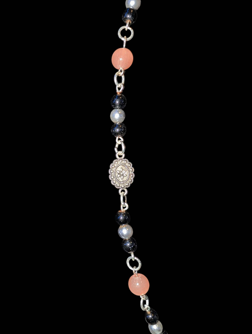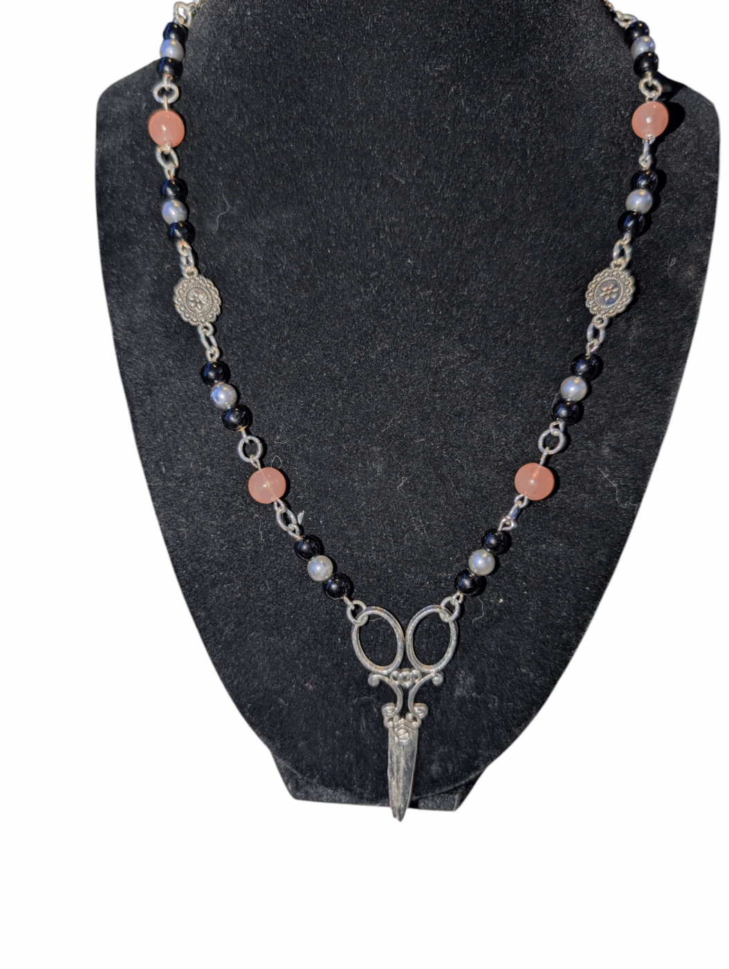 Cutting charm features Malaysia Jade, black and grey faux pearls, as well as metal flower charms that add a delicate touch to the necklace. The main pendant is a Silver pair of scissors, Cutting Charm is perfect for any crafty person!