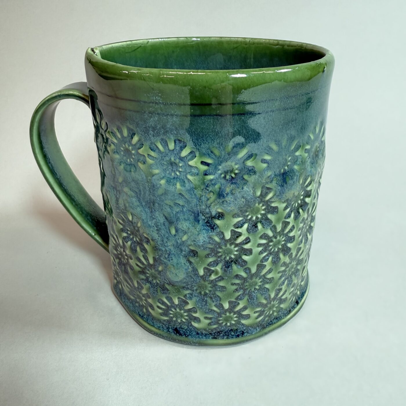 This is a large hand built mug with a sturdy 2-3 finger handle for comfort and textured with a daisy floret design. It has been glazed in a high gloss copper green with turquoise and blue drip.