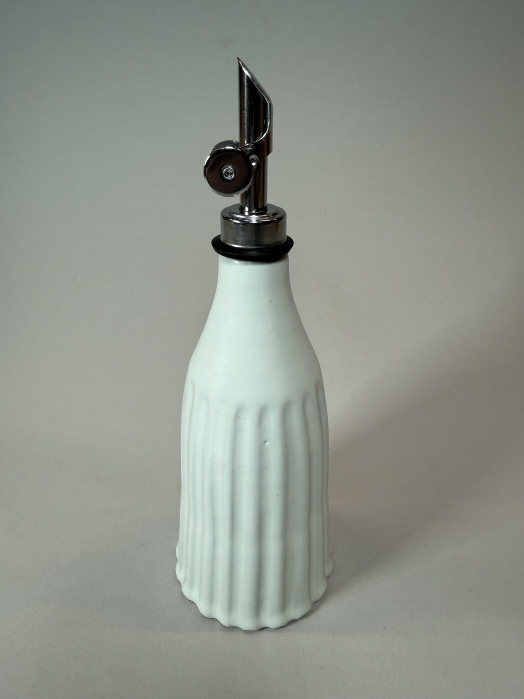 Elevate your kitchen with this beautifully handcrafted stoneware oil decanter, designed to blend timeless craftsmanship with modern elegance. This piece is carefully hand-fluted, creating subtle ridges that catch the light and add a refined, tactile dimension. The surface is finished in a soft, opaque satin white glaze, offering a smooth, understated sheen that complements any kitchen décor—from minimalist to rustic.