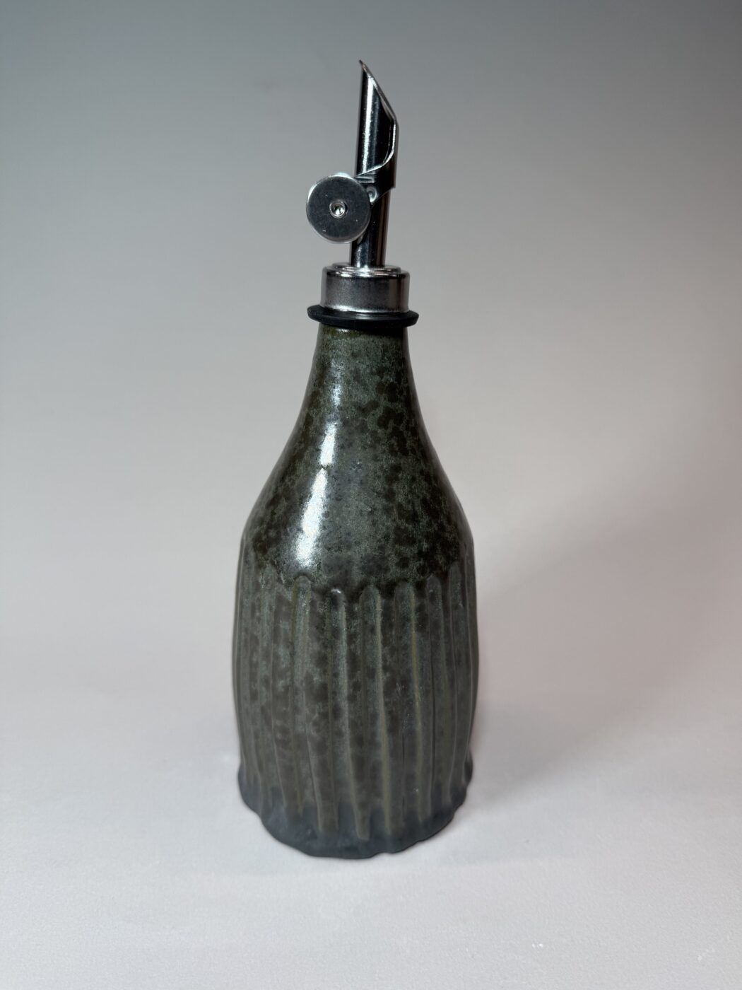 Elevate your kitchen with this beautifully handcrafted stoneware oil decanter, designed to blend timeless craftsmanship with modern elegance. This piece is carefully hand-fluted, creating subtle ridges that catch the light and add a refined, tactile dimension. The surface is finished in a smooth, rich, opaque mottled glaze that showcases speckled shades of green to complement any kitchen décor—from minimalist to rustic.
