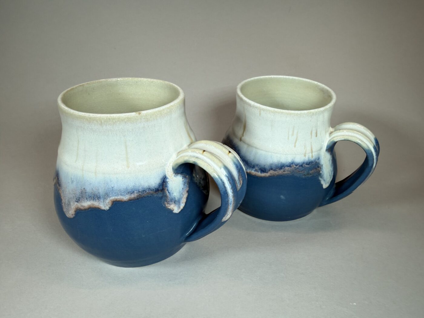 Details: Both mugs (2) are not identical but similar in size and colour. Holds approximate 250 ml. Small belly shape retains temperature of beverage for longer periods of time. Handle is 2 finger hold with an ergonomic thumb ball for leverage.