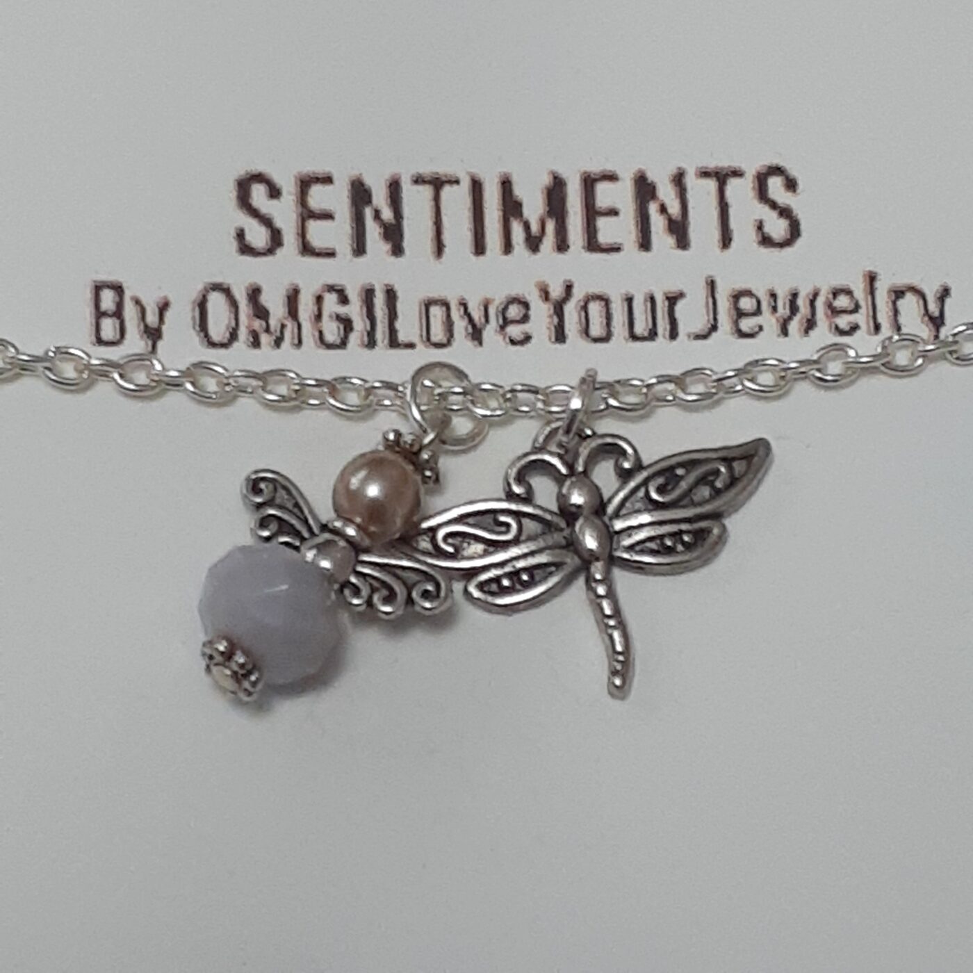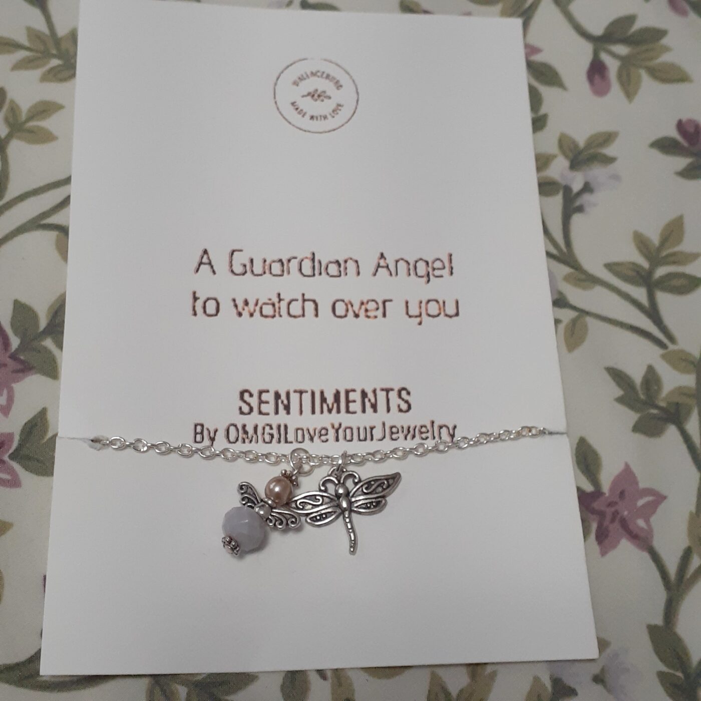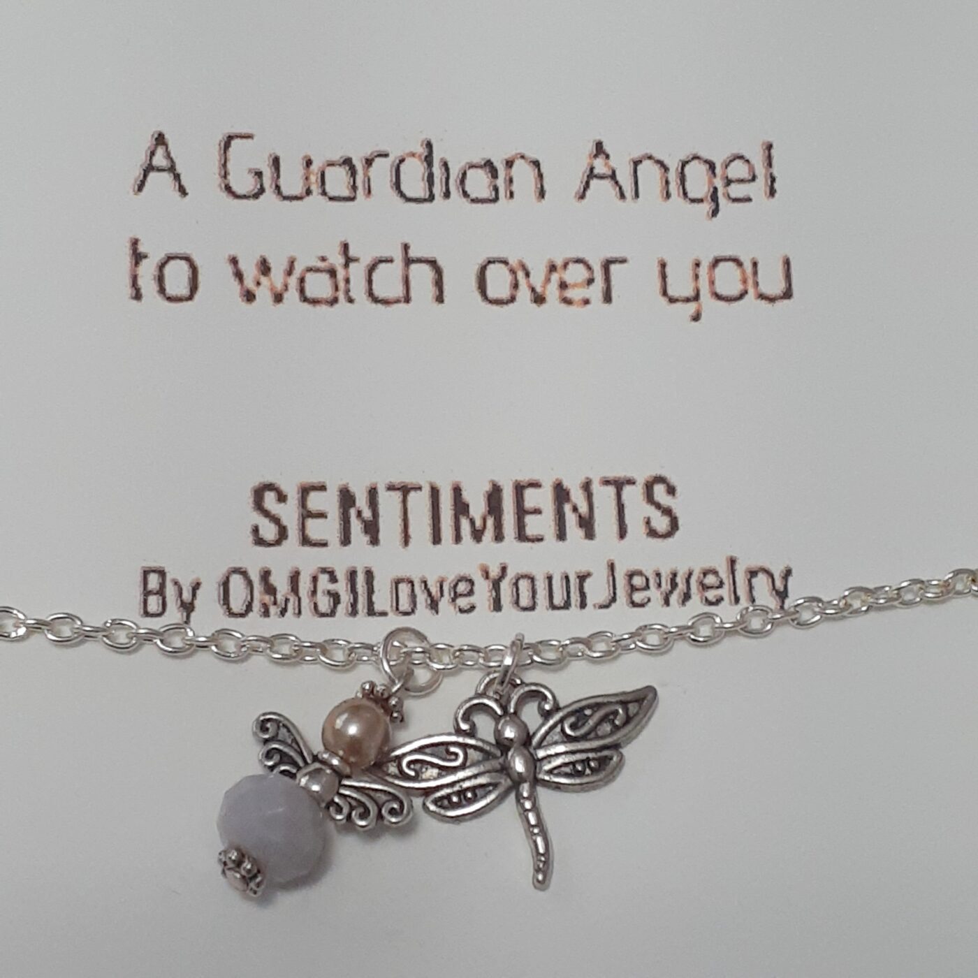 Sentiments Collection ~ Sterling silver Guardian Angel Necklace with a silver dragonfly charm and angel handmade by me with pearl and Czech crystals. A guardian angel to watch over you. The sterling silver necklace measures 18.5 inches long but I can make it to suit. Please contact me.