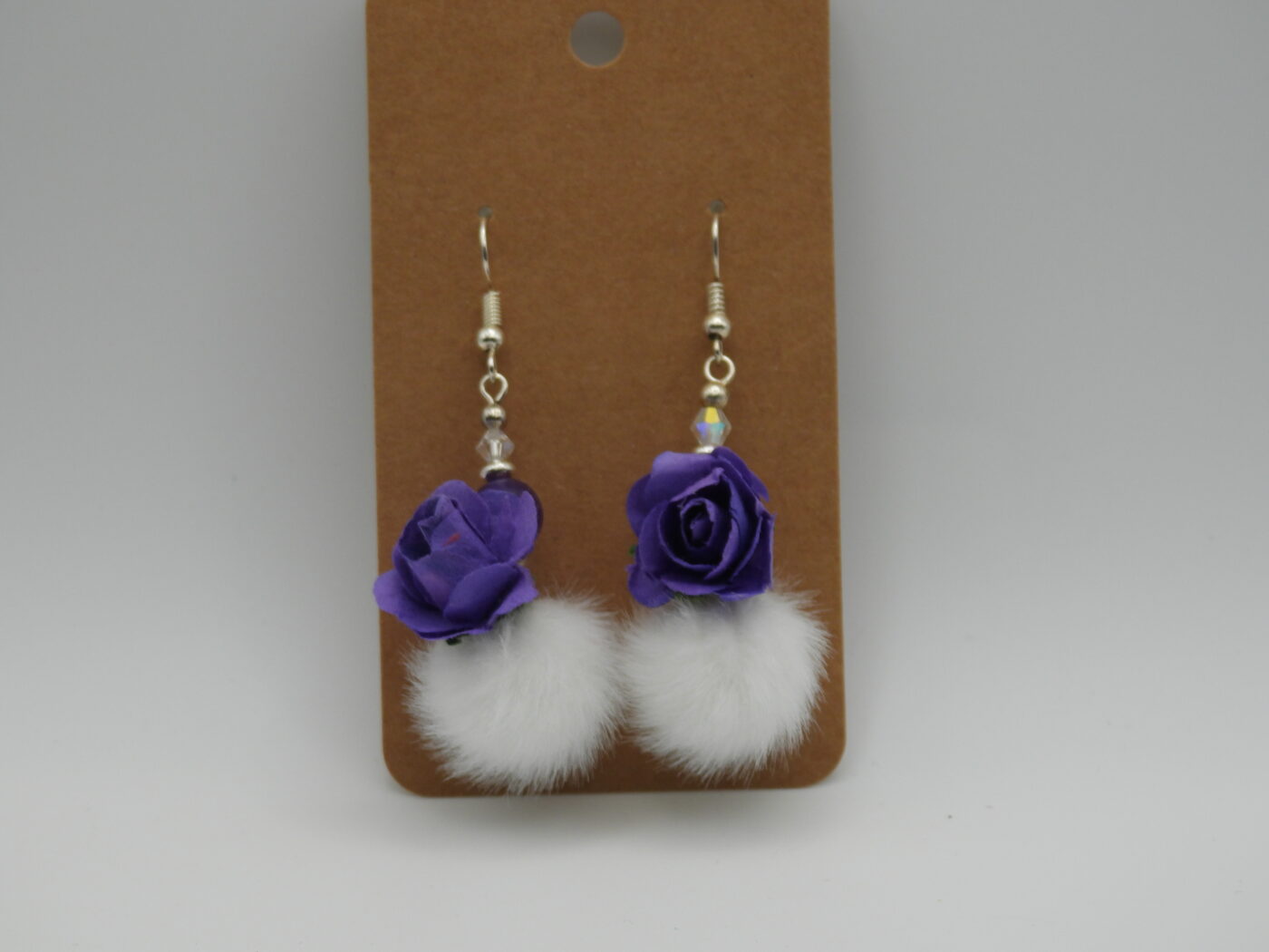 Fluffy pom pom dangle, drop earrings. Adorable plush pure white faux fur with tiny paper roses as accents, with Swarovski crystals for that extra sparkle and shine. The earrings measure approx. 2 inches from the tops of the earwires. You’ll love these one-of-a-kind earrings. Similar earrings will be available in my shop.