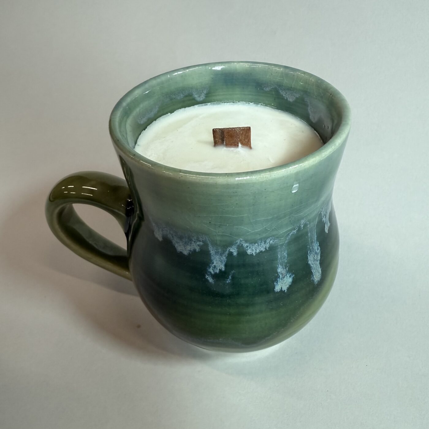 This stoneware wheel thrown mug is a two in one special.  The candle has been poured by Erie Shores Candle Co with her signature scented soy wax and