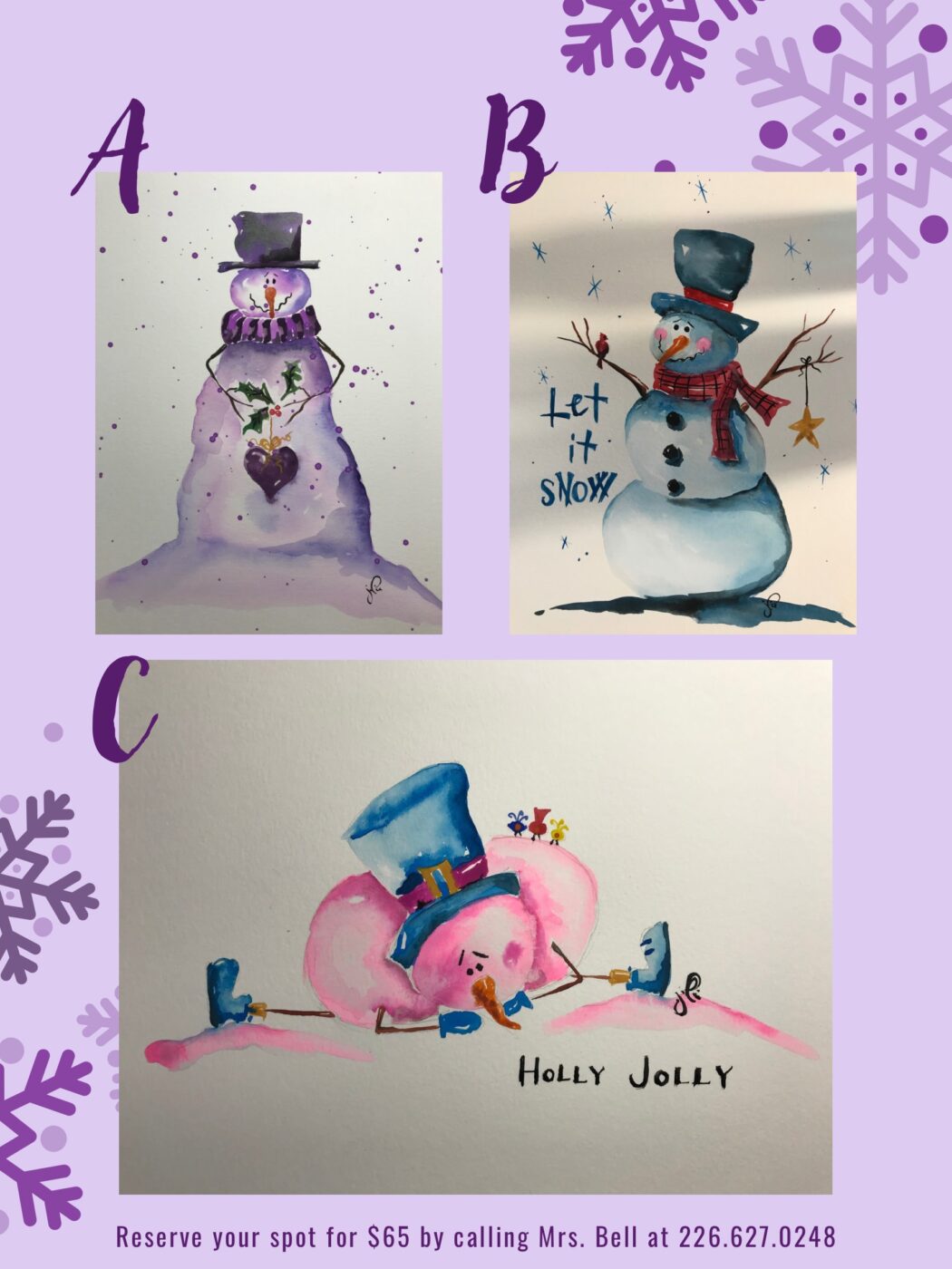 Create your very own holiday themed watercolour painting. No experience required! You’ll be taught by a professional artist and everything will be provided for your session, including a light sketch of the design you choose (A,B, or C).