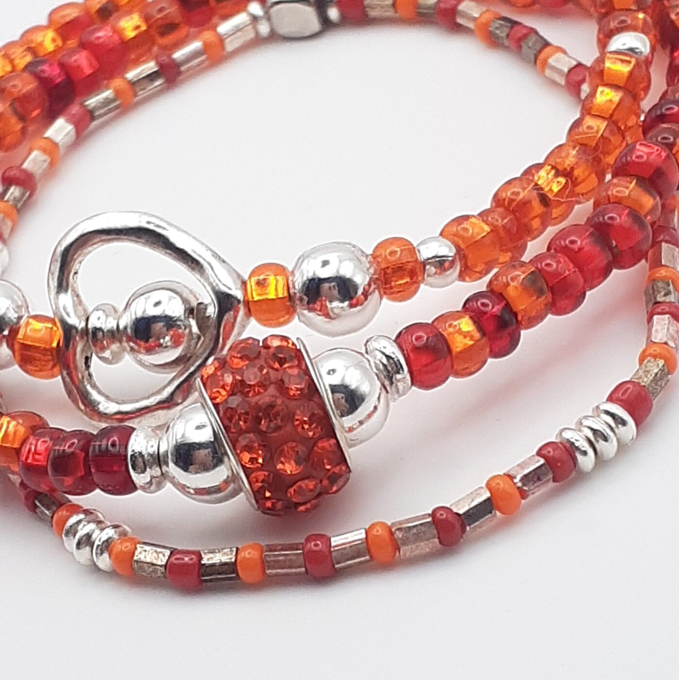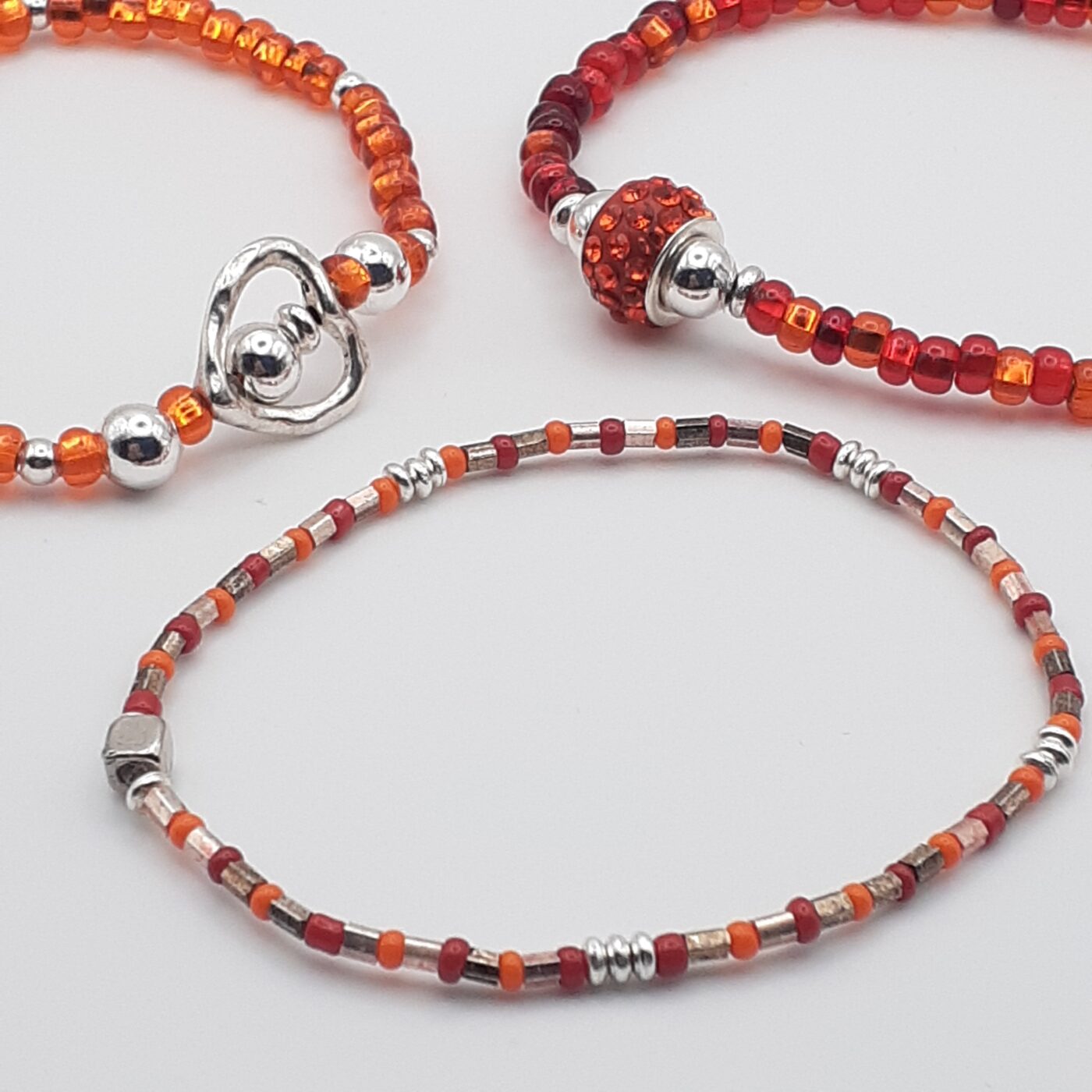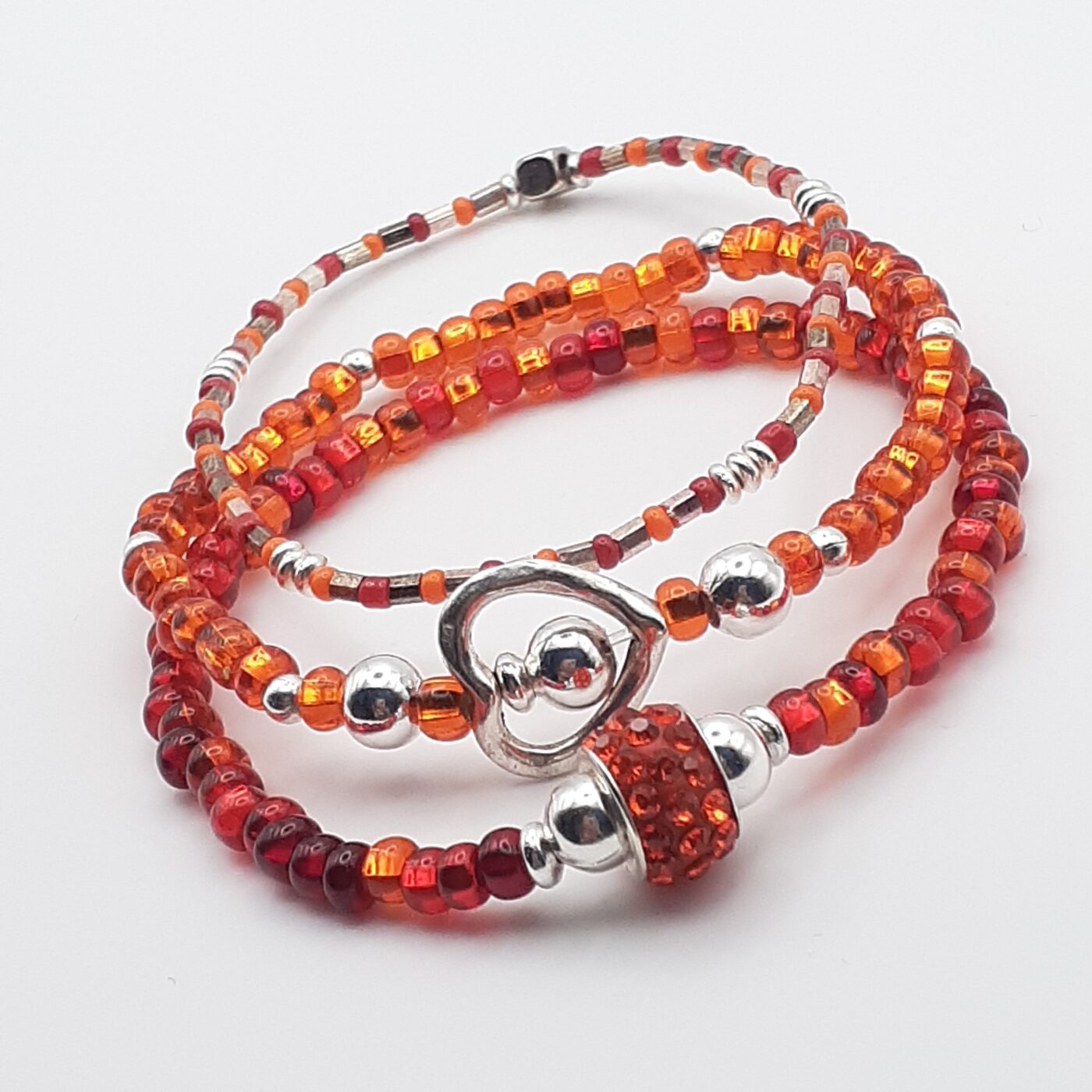 Vibrant red and orange, and warm-toned glass seed beads with silver accents. Intense sparkle from the beads and shine from the polished silver open heart-shaped charm. Loads of bling in the rhinestone focal bead. Definitely an eye-catching set. Great for daily wear or casual outfits, or for Valentine’s Day gifts These are designed for layering or wearing individually. Fits a 6.5 inch wrist.