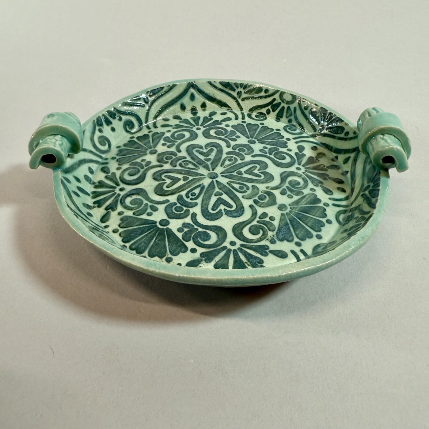 Multi use dish that sits on 4 little feet and is embellished with two handles. It has been decorated with French blue green mandala motif covered in a translucent turquoise glaze.