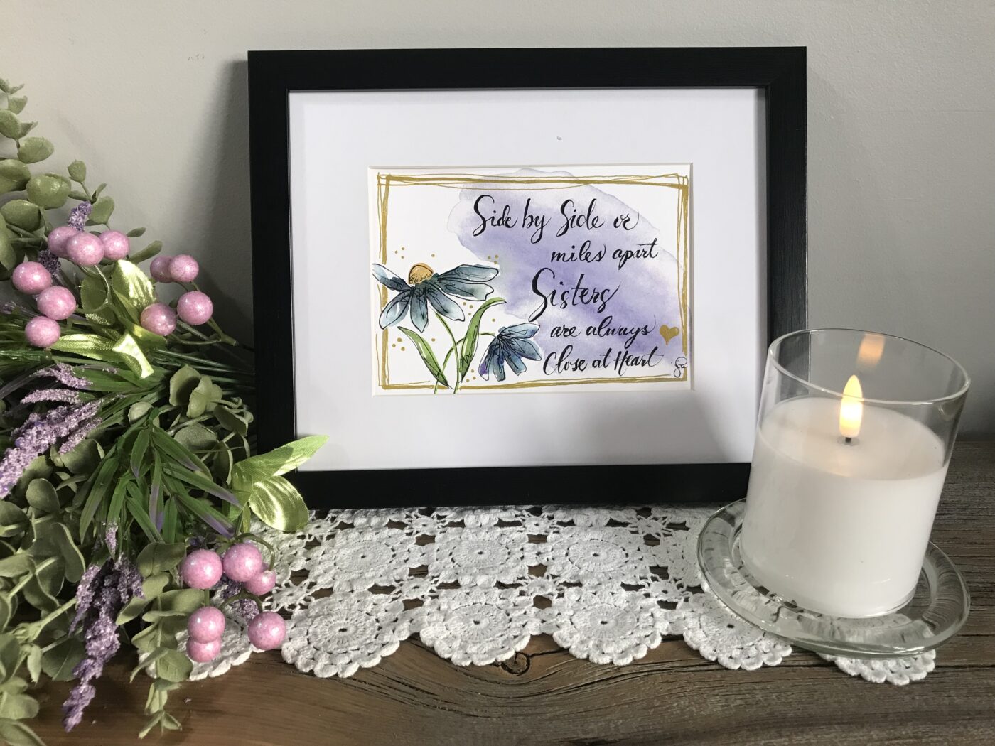 This stunning piece has a beautiful sentiment for the special sister in your life – “Side by side or miles apart, Sisters are always close at heart.” Watercolours and ink pen.