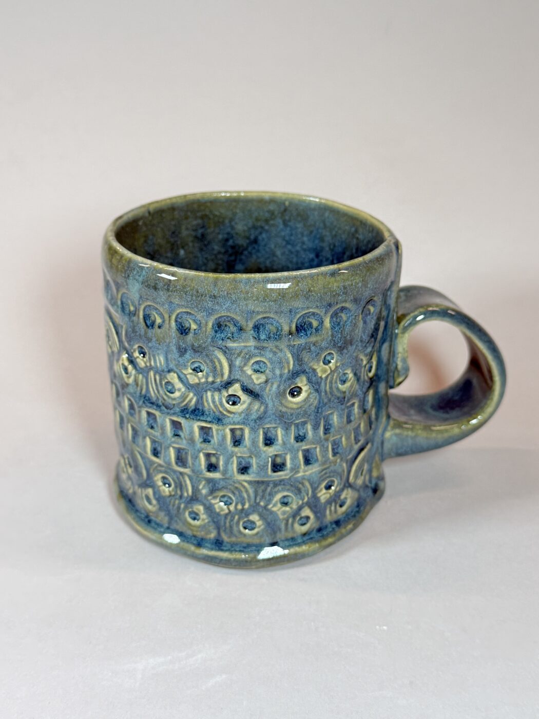 There’s something quietly captivating about this handmade stoneware mug—the kind of piece you reach for not just out of habit, but because it feels right in your hands. Its glaze is a rich cerulean blue, deep and fluid, settling into every carved texture like water finding its path. Along the raised edges, the colour shifts and breaks into soft green tones, creating a natural, almost organic gradient that feels alive.