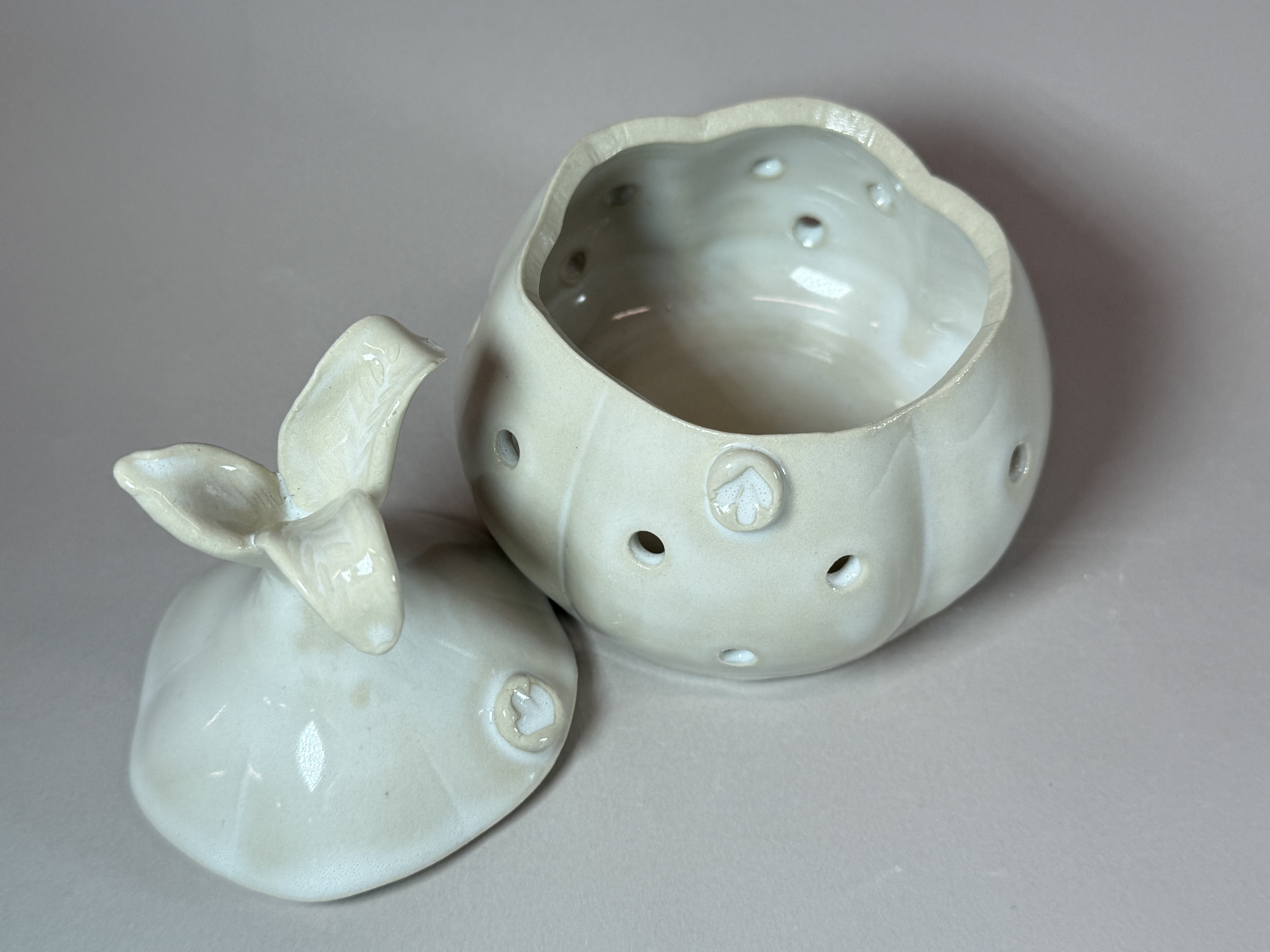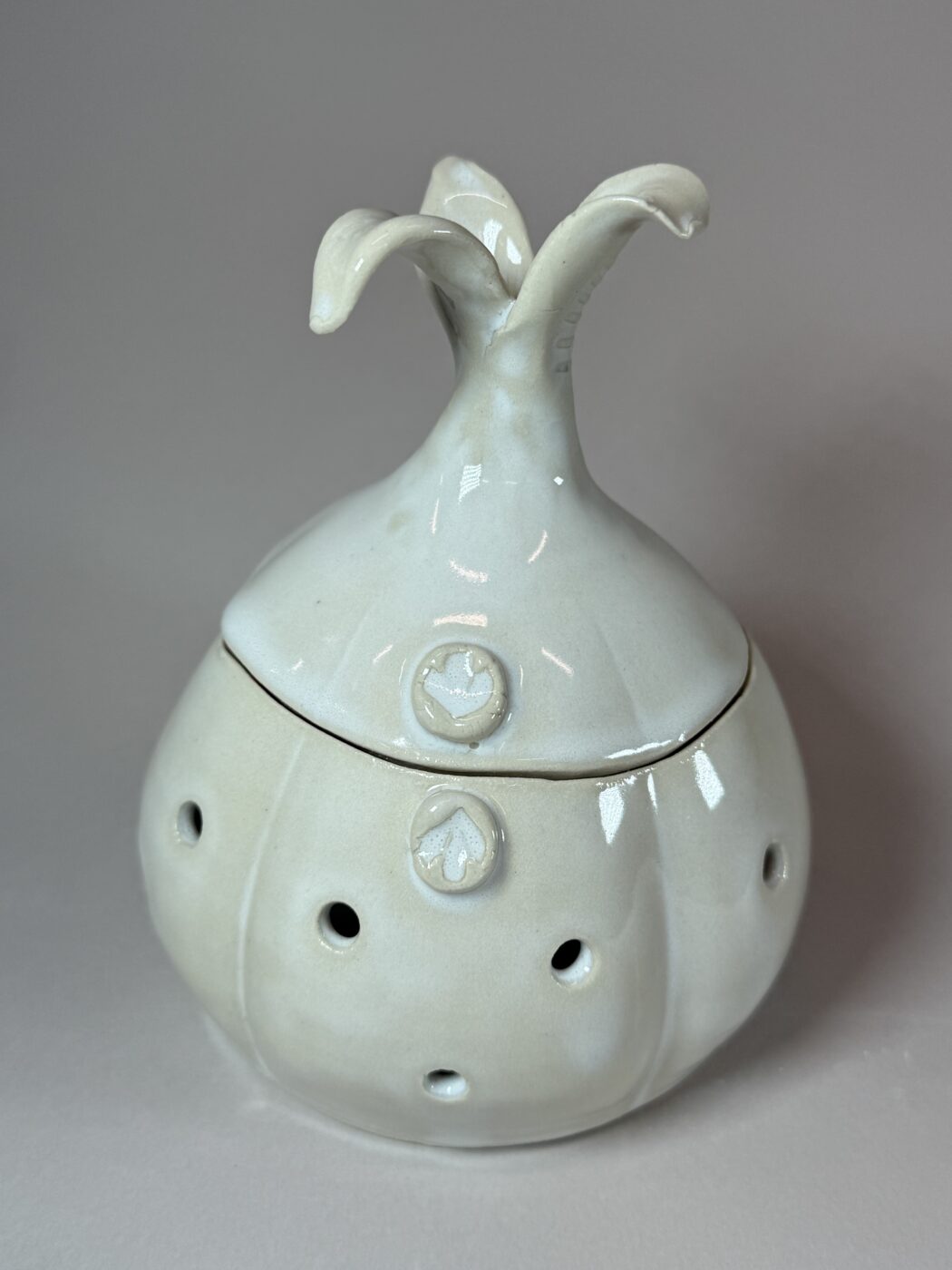 Bring both charm and purpose to your kitchen with this handmade stoneware garlic keeper, thoughtfully shaped like a plump garlic clove. Its sculptural form is as delightful as it is functional, with carefully placed ventilation holes that allow air to circulate—helping keep each clove fresher for longer.