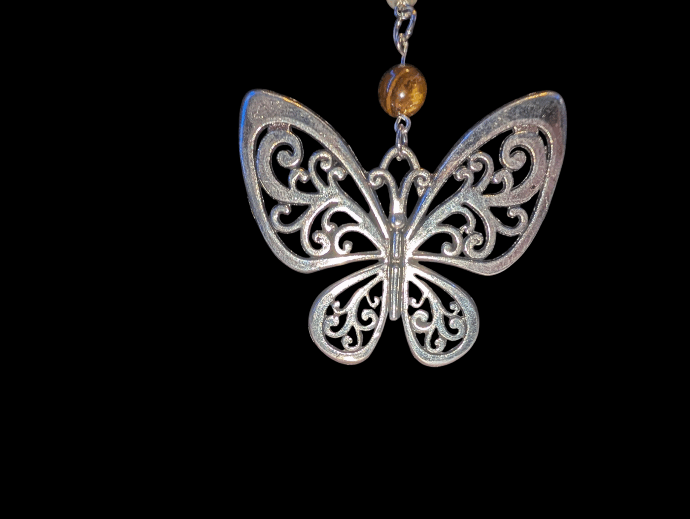 This groovy butterfly necklace is sure to bring a feeling of nostalgia for anybody who loves the fun and fresh colours of this faux pearl necklace, with a Tiger’s Eye bead for courage, focus, and self-empowerment.