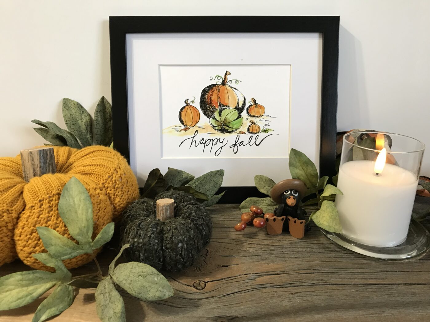 Part of my Autumn Collection. This piece captures the soft and cozy colours of Autumn, with a beautiful patch of pumpkins and a festive message: “Happy Fall”. Such a perfect decor piece for the harvest season and beyond. Micron ink pen and watercolour design.