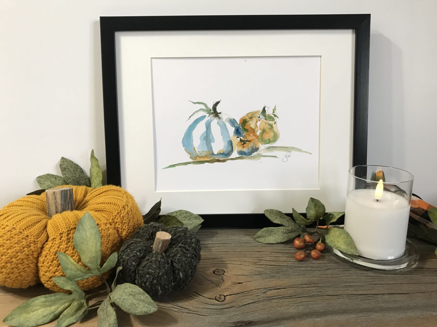 Part of my Autumn Collection. This piece captures the soft and cozy colours of Autumn, featuring a harvest of pumpkins in Autumn tones. Such a perfect decor piece for the harvest season and beyond. Micron ink pen and watercolour design.