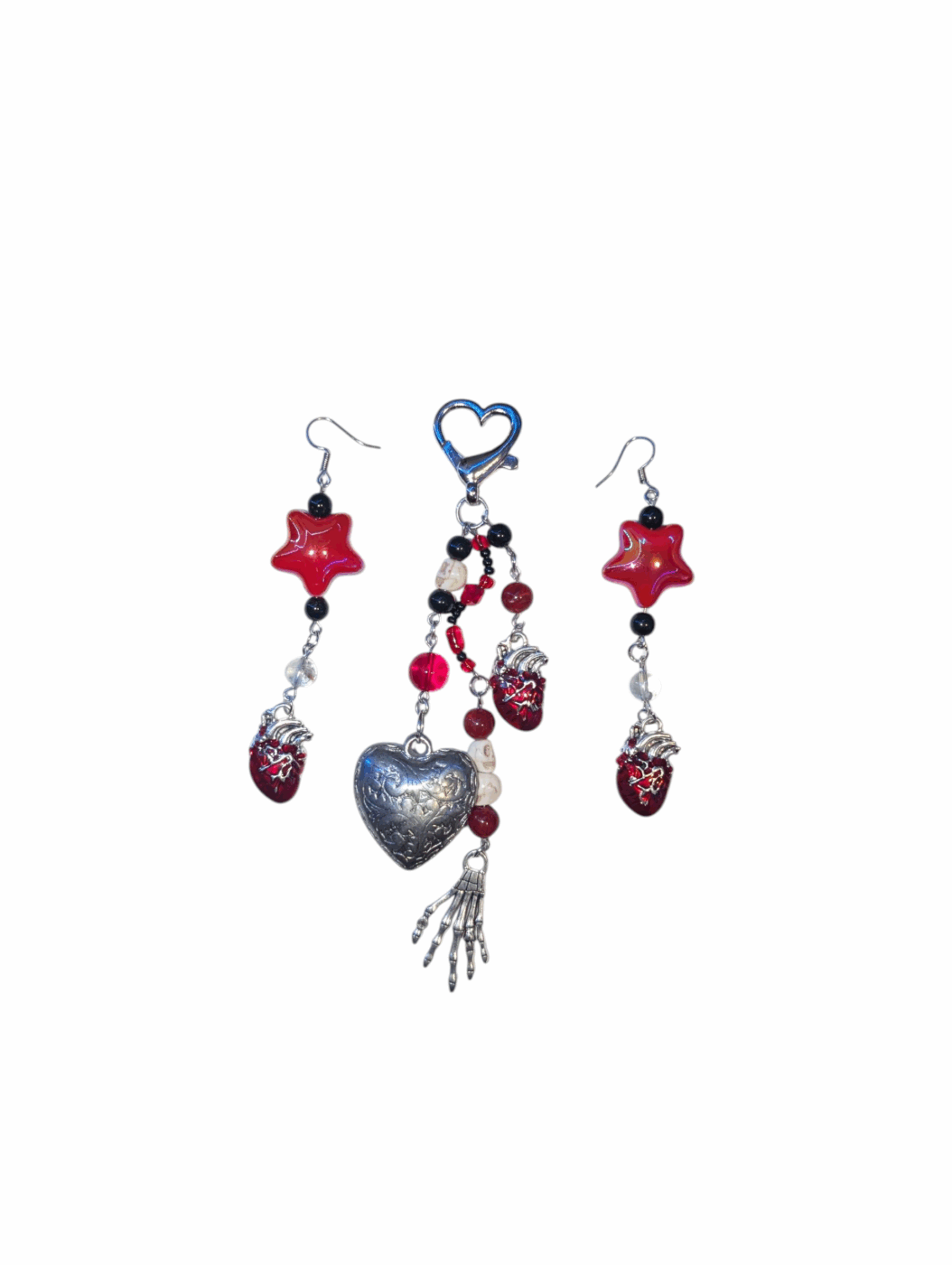 Add a bold, gothic touch to your outfits with the Heart of Horrors Set, featuring a handcrafted keychain and matching earrings. This striking duo blends dark romance with spooky charm through a mix of deep red beads, glossy star charms, and anatomical heart pendants. All made in a gleaming Silver.