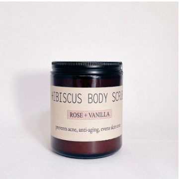 Ingredients: sugar, sea salt, shea butter, coconut oil, sunflower oil, hibiscus powder, rose & vanilla essential oil